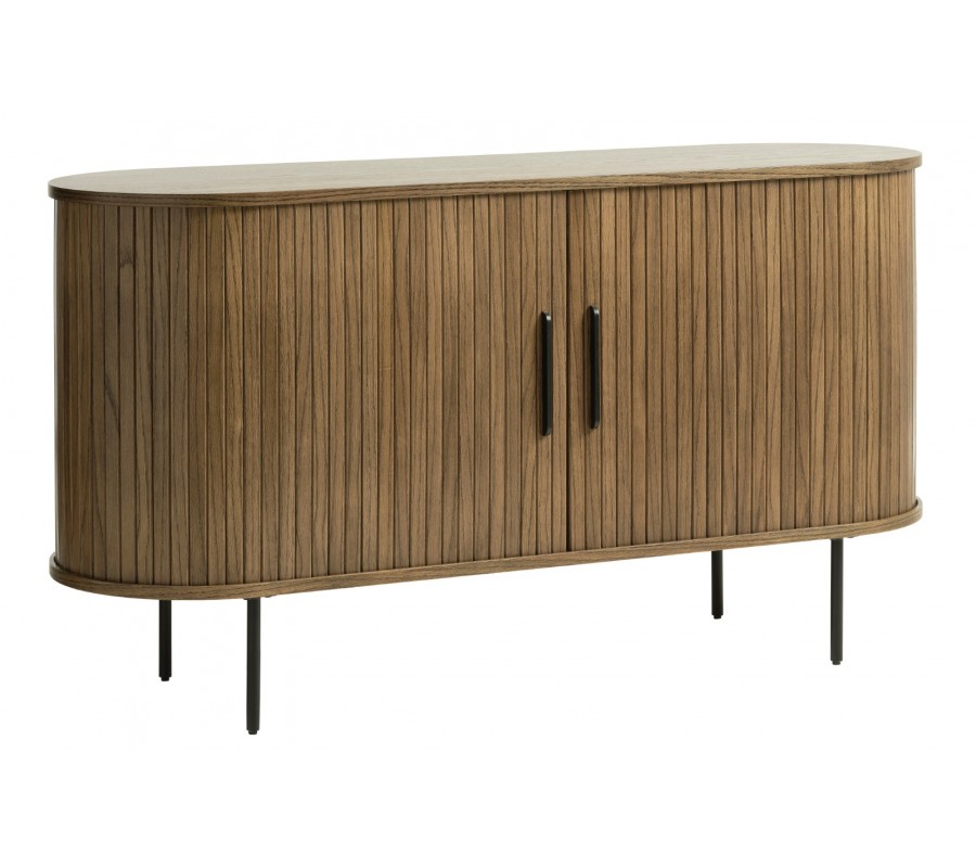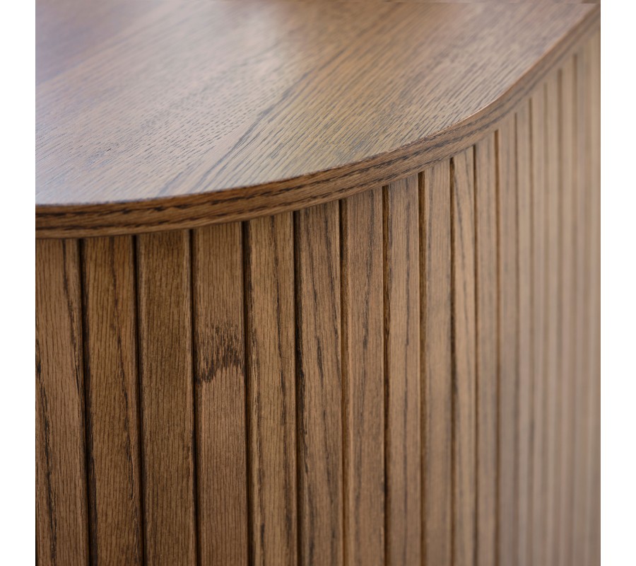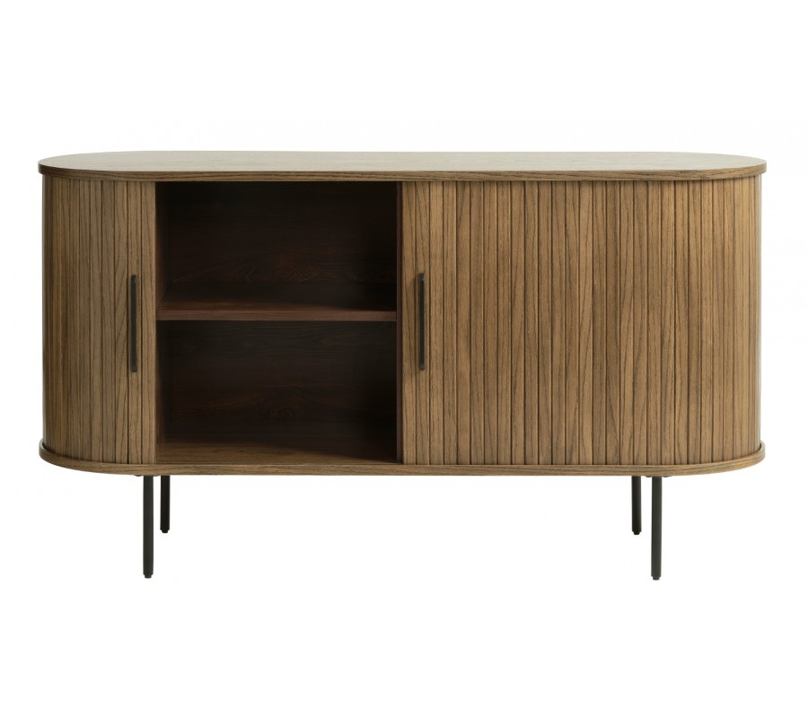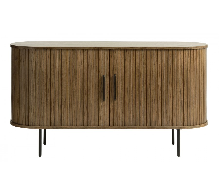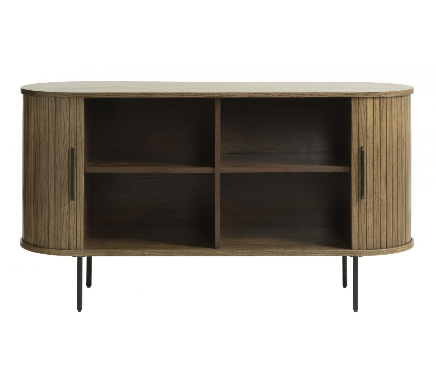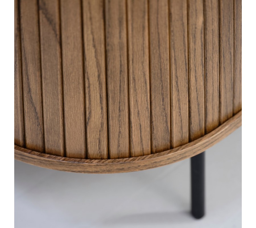 Retro tmavý hnedý dubový príborník Bornholm oválneho tvaru s dvomi posuvnými dvierkami s vertikálnym lamelovým zdobením 140 cm