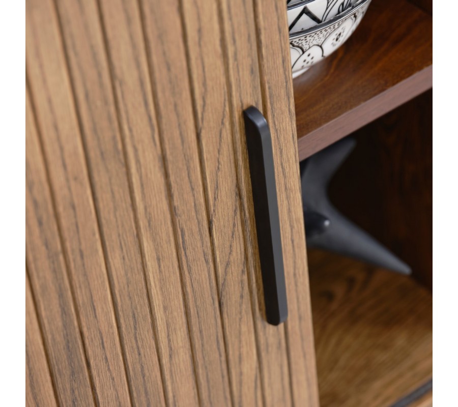 Úložná časť má oválny tvar a je rozdelená pomocou vertikálnej a horizontálnej priečky na štyri rovnaké police. Horná doska je hladká a necháva vyniknúť štruktúru dreva, zatiaľ čo strany zdobia vertikálne lamely inšpirované retro štýlom. Posuvné dvierka sú prirodzene zakomponované do tohto dekoru a dopĺňajú ich dlhé štíhle úchytky. Príborník stojí na štyroch tenkých valcovitých nohách, čo zabezpečuje stabilitu aj vizuálnu ľahkosť.