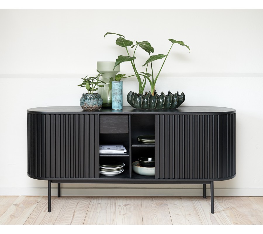 Príborník Odense je elegantným spojením moderného dizajnu s luxusným art deco vizuálom. Čierne prevedenie mu dodáva sofistikovanosť a v kombinácii s originálnou siluetou z neho robí výrazný doplnok jedálne.