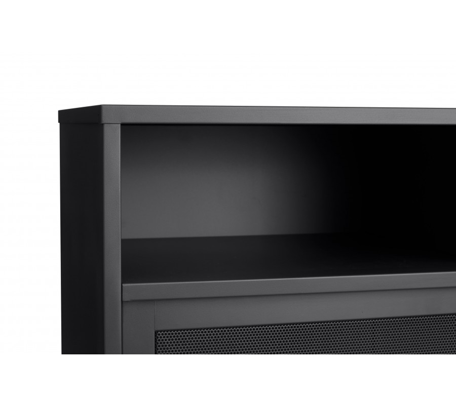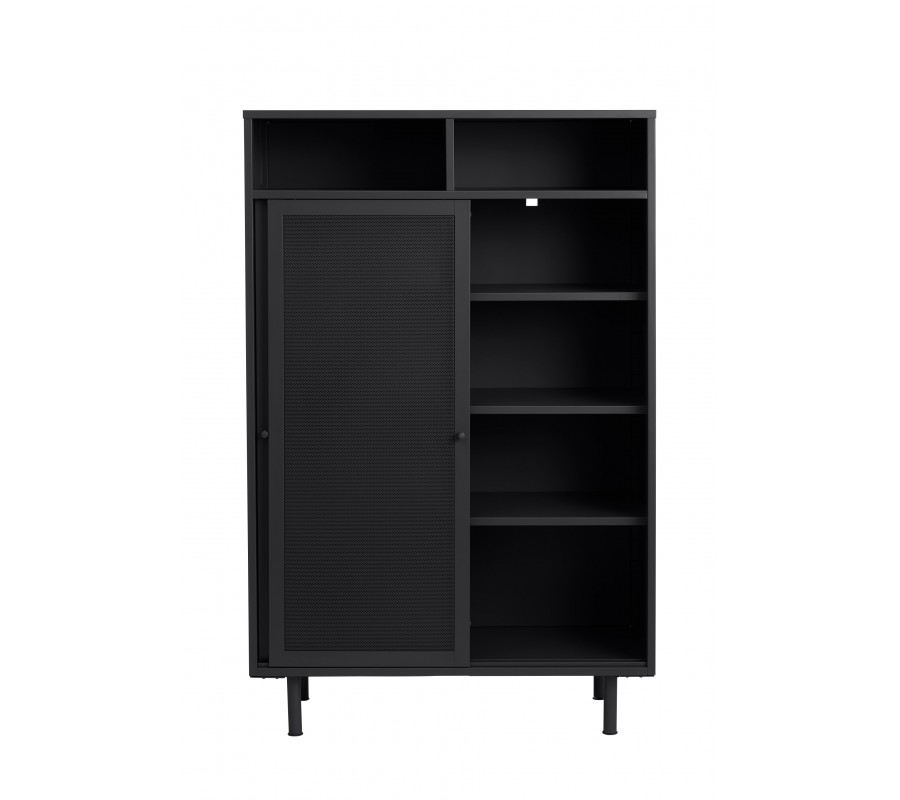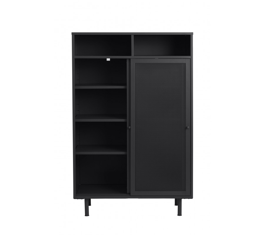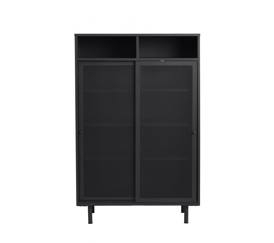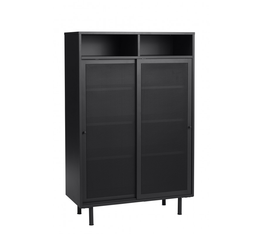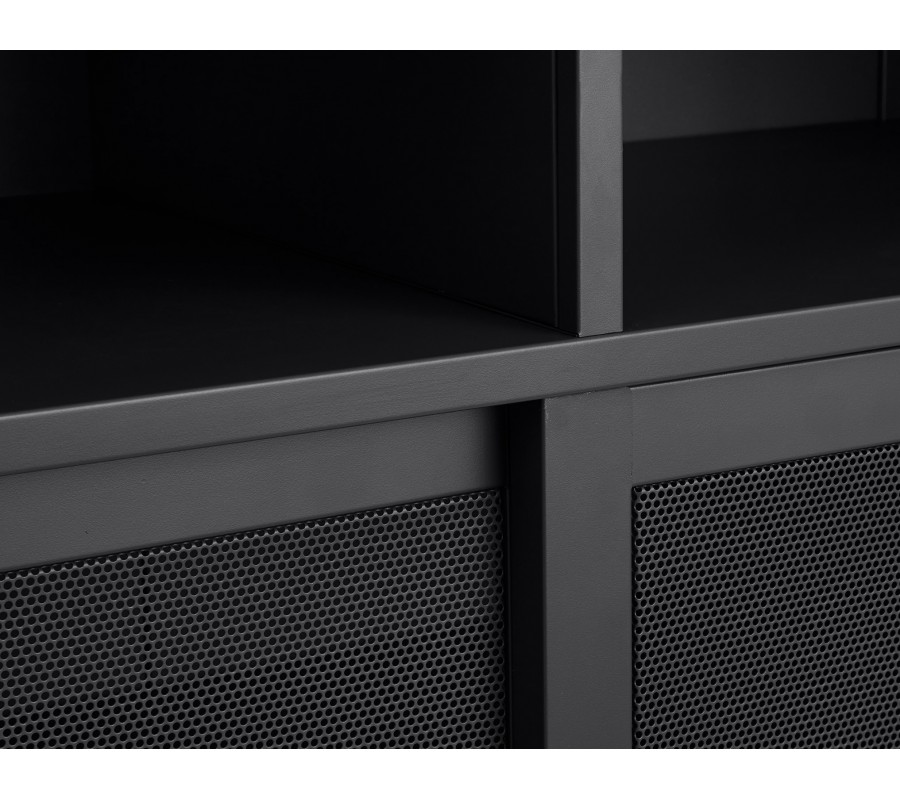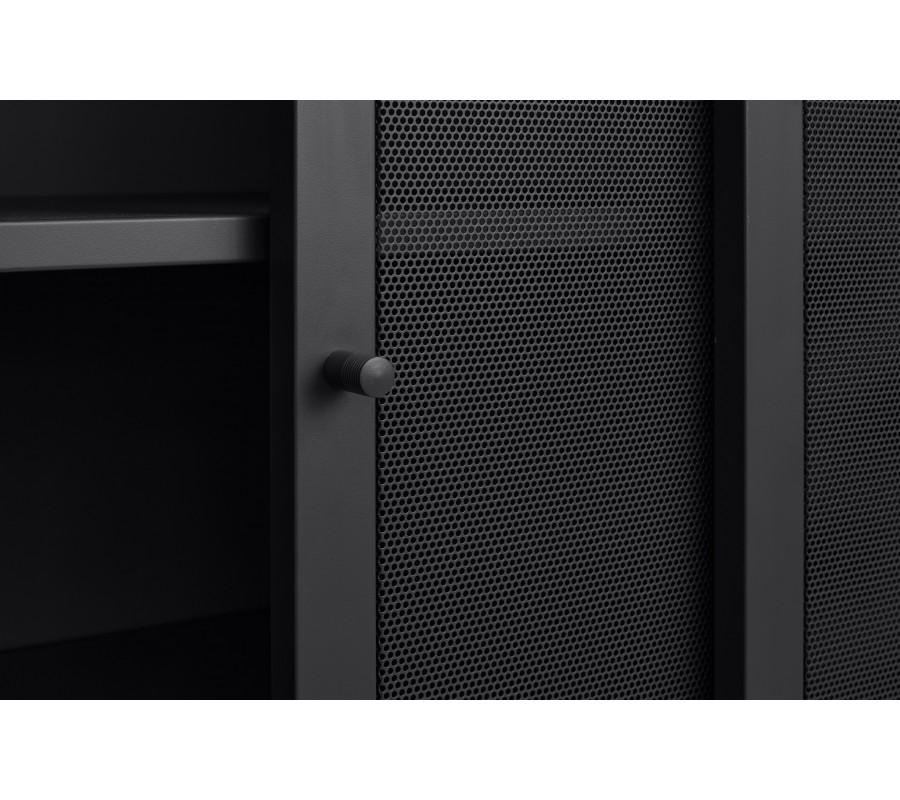 Industriálny vysoký príborník Vejle z kovu v čiernej farbe s policami a dvomi posuvnými perforovanými dvierkami 140 cm