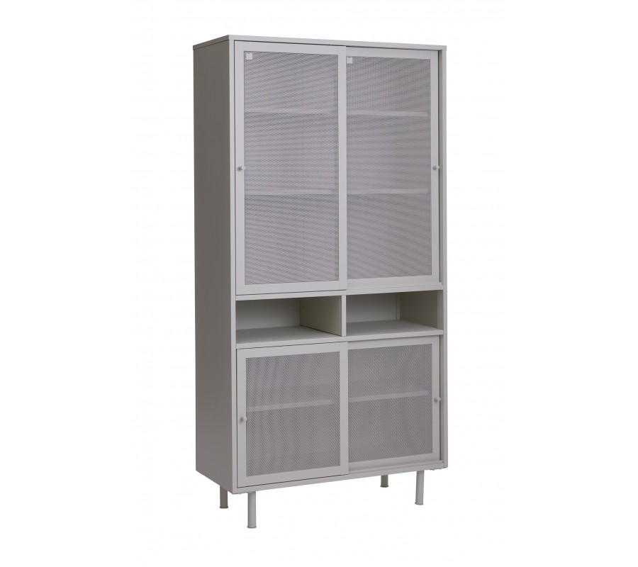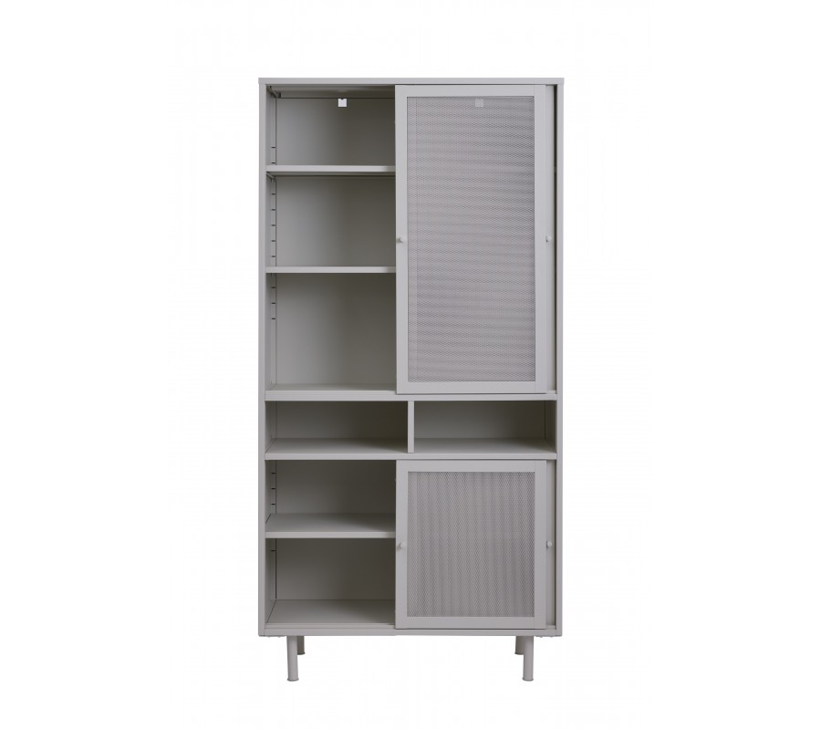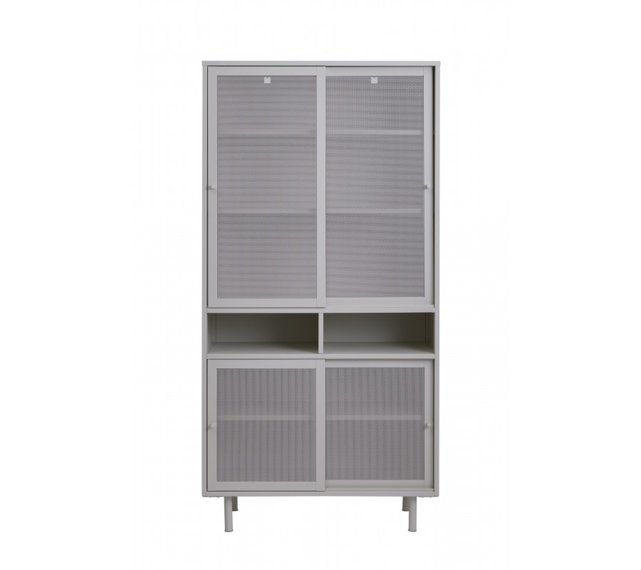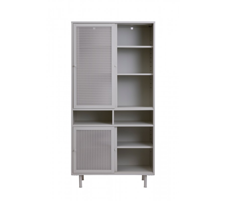 Moderný kovový vysoký príborník Vejle s perforovanými posuvnými dvierkami a policami v sivobéžovom odtieni greige 180 cm