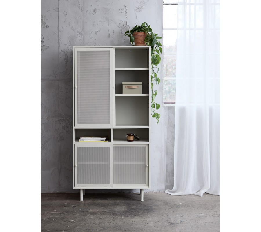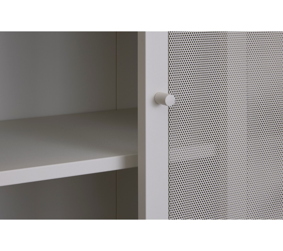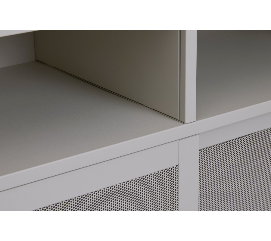 Príborník je vyrobený z kovu, ktorý mu dodáva industriálny výraz. Zjemňuje ho matná povrchová úprava vo svetlom odtieni greige, kombinujúca sivú a béžovú farbu. Zvýrazňuje jeho neutrálny minimalistický vzhľad a ľahko sa kombinuje s ďalším nábytkom.