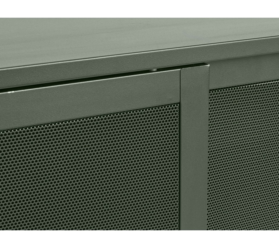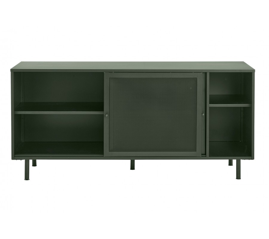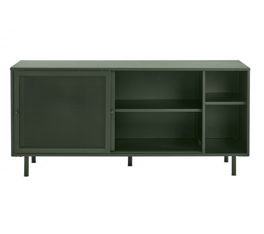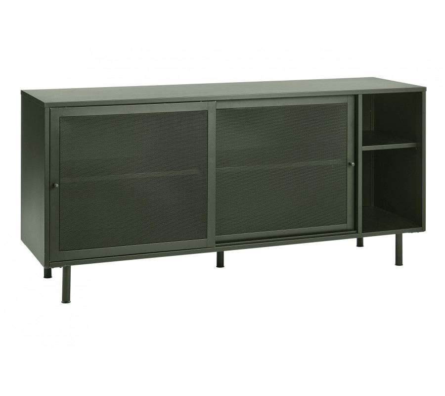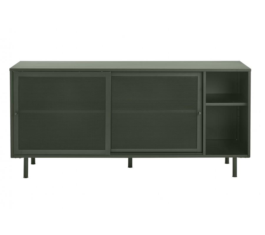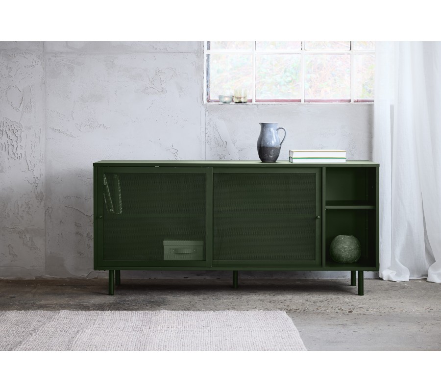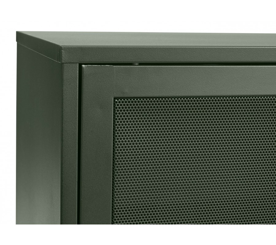 Príborník je vyrobený z kovu, čo mu zaručuje vysokú pevnosť a odolnosť. Povrchová úprava v olivovej zelenej farbe pôsobí sofistikovane a vďaka matnému finišu zároveň živo a hrejivo.