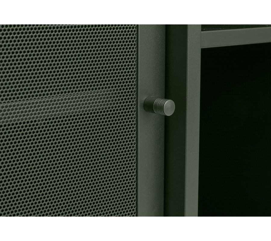 Moderný industriálny príborník Vejle s dvomi perforovanými dvierkami a policami z kovu v olivovej zelenej farbe 160 cm