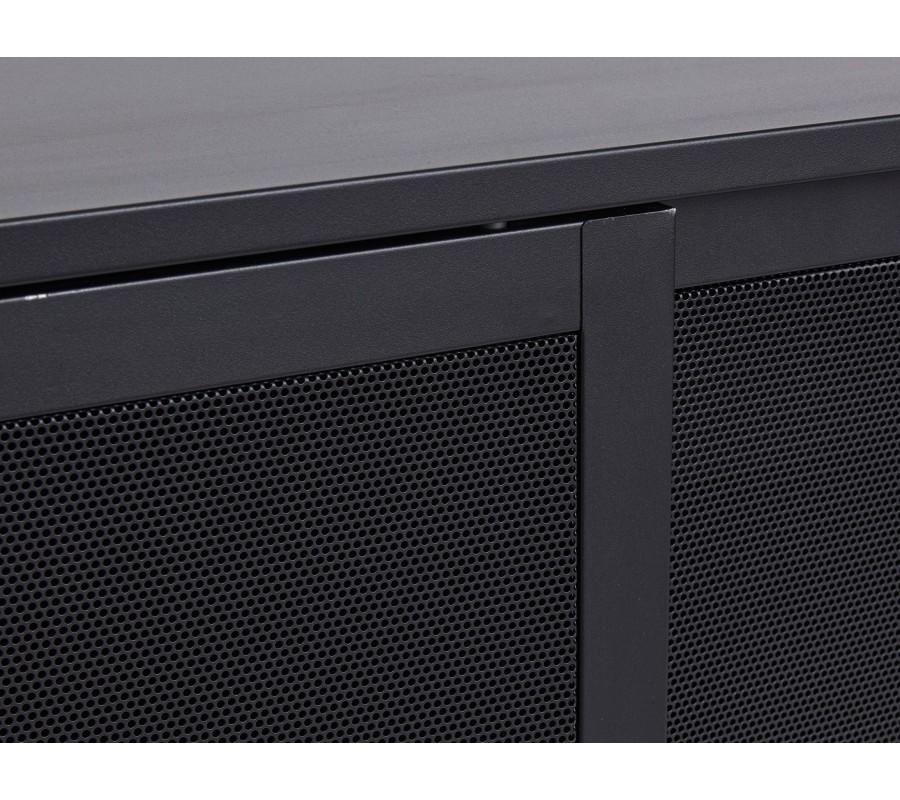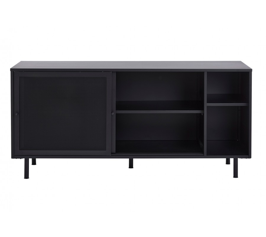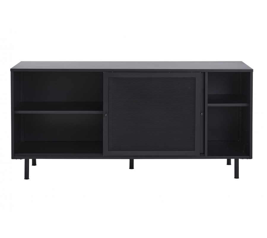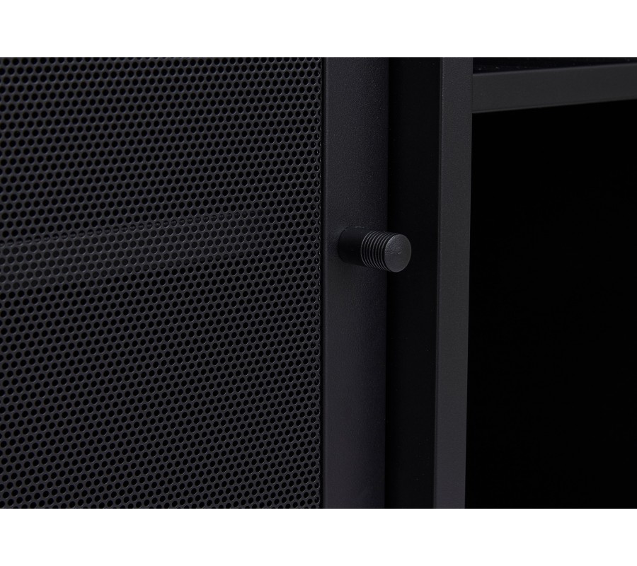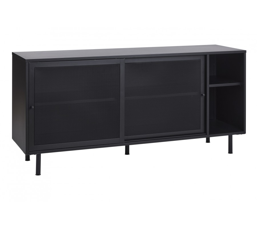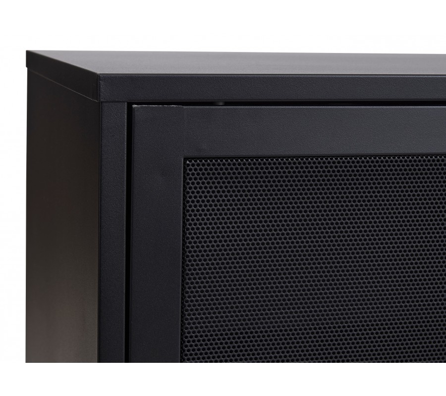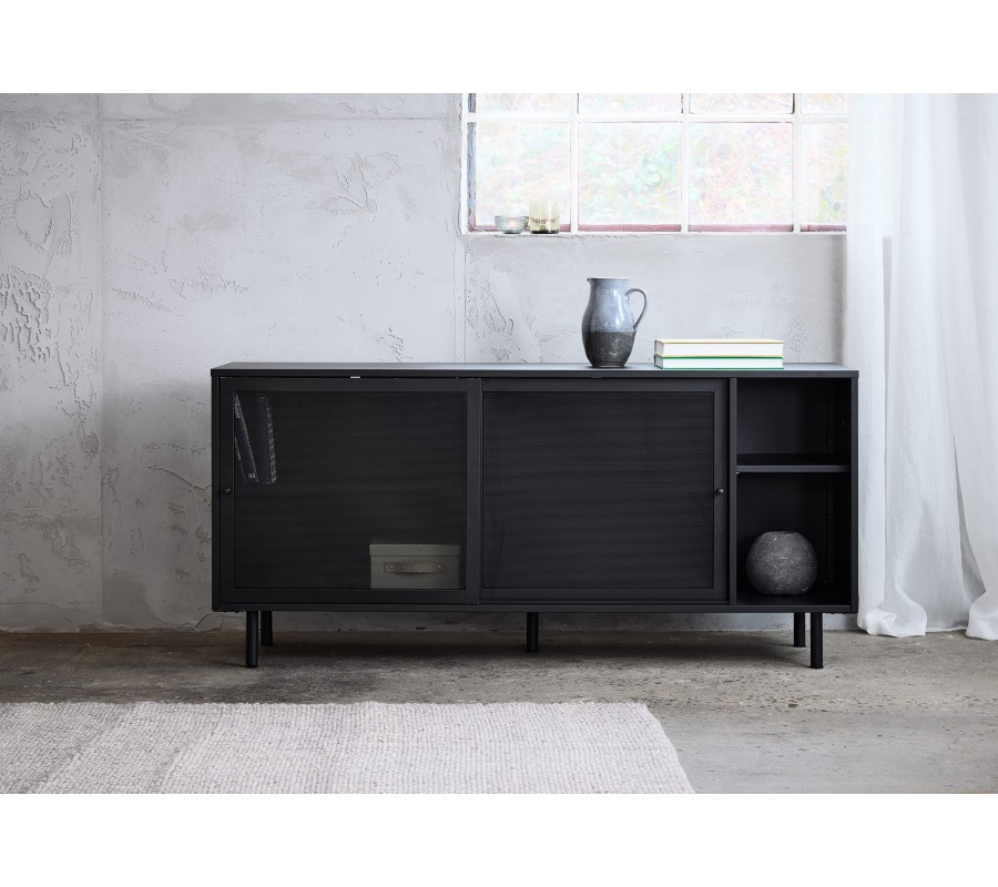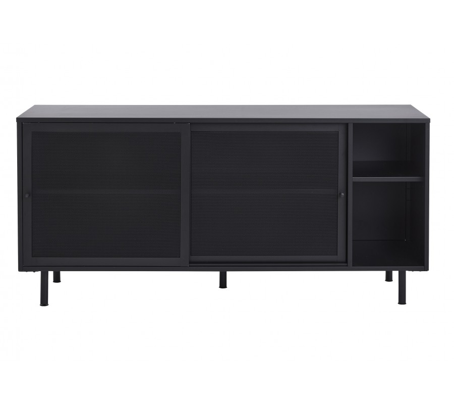 Industriálny čierny kovový príborník Vejle s policami a dvomi posuvnými dvierkami s perforovaným polopriehľadným vzorom 160 cm