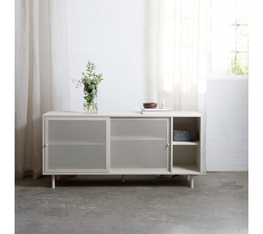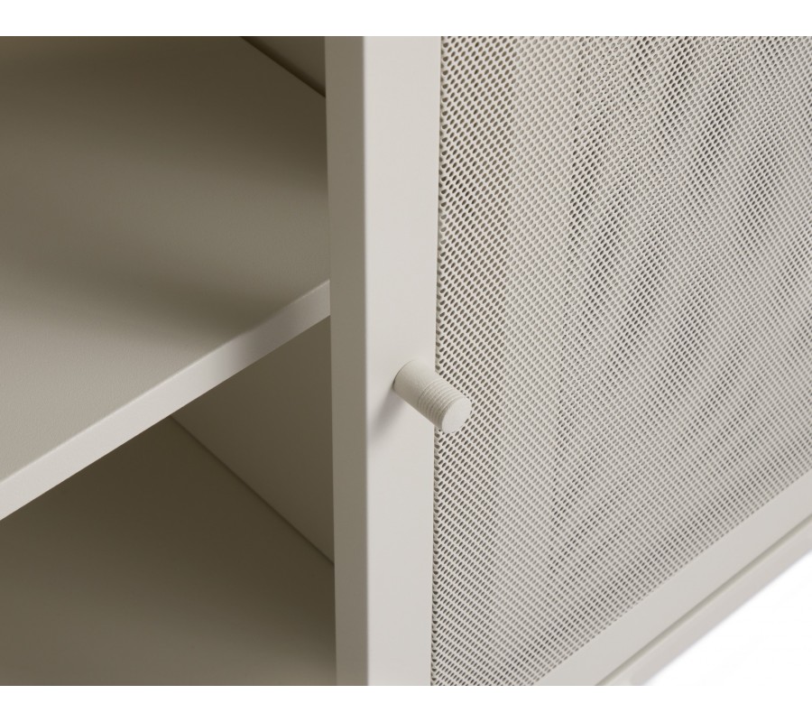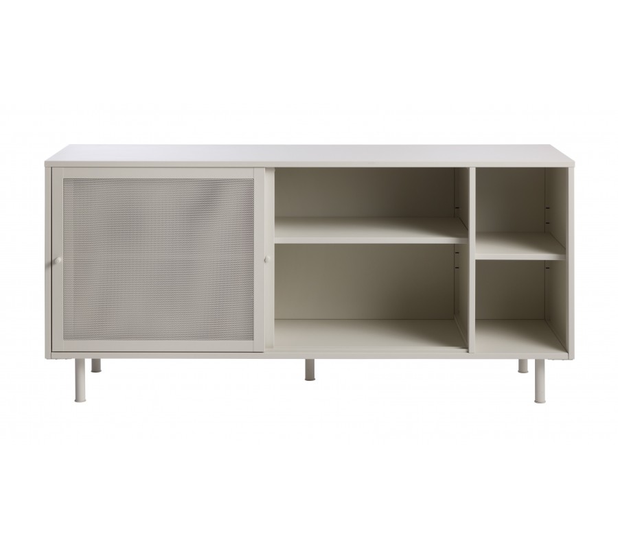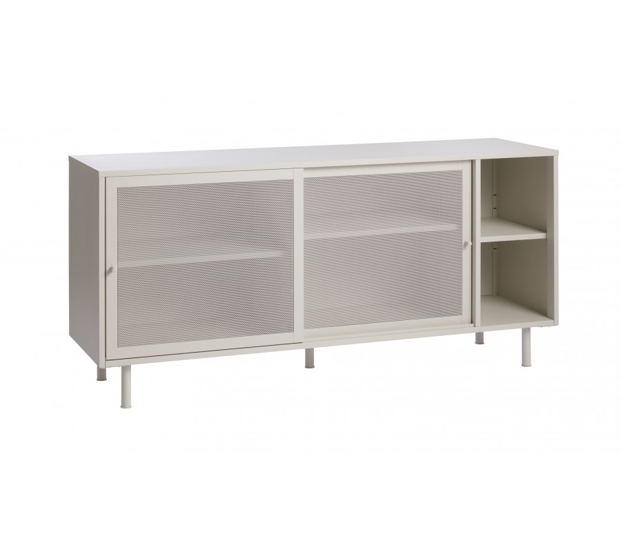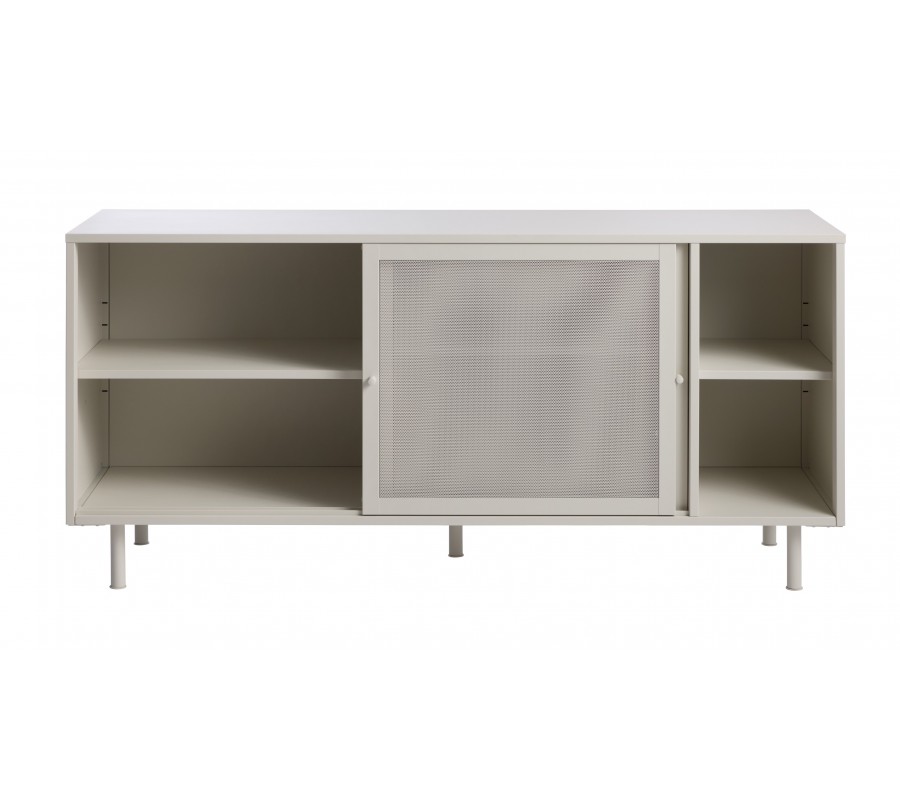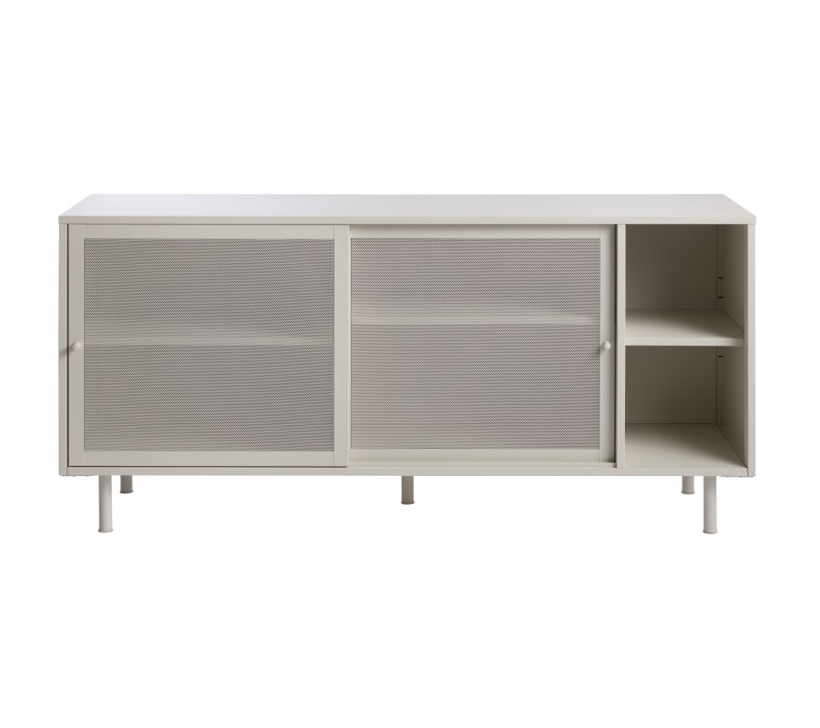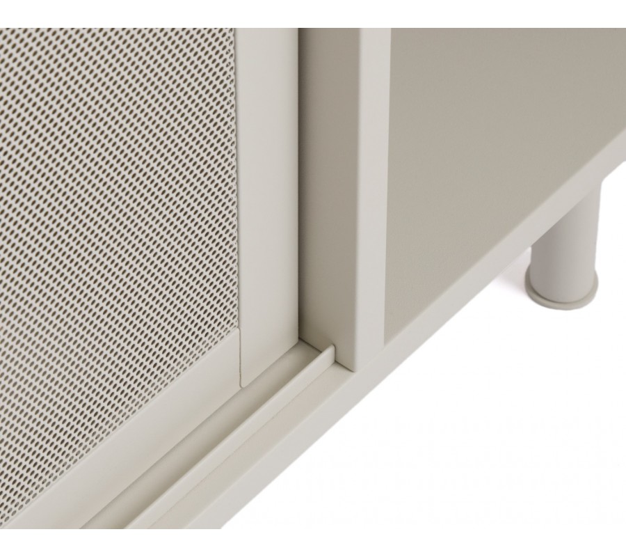 Moderný béžovo sivý príborník Vejle v odtieni greige z kovu s dvomi posuvnými perforovanými dvierkami a policami 160 cm