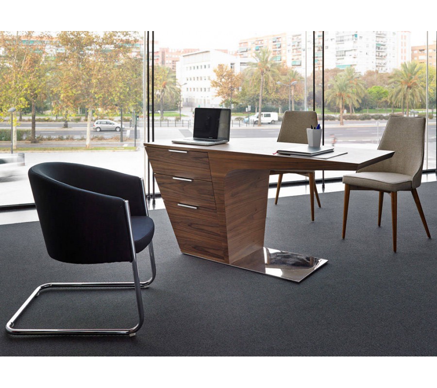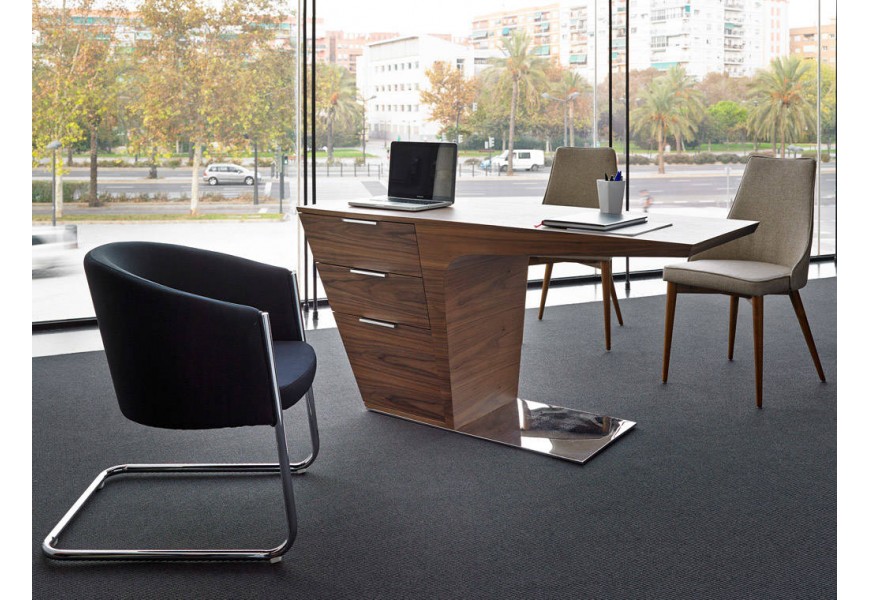 Centrálnym prvkom zostavy je písací stôl s asymetrickou siluetou. Je funkčným nábytkom a zároveň svojím atypickým tvarom pôsobí aj ako moderný dekoračný prvok. Chrómovú podstavu a úchytky na zásuvkách výborne dopĺňa kancelárska stolička s čiernym koženým poťahom a metalickým lesklým rámom. Stoličky pre hostí majú nožičky v rovnakom farebnom prevedení a čalúnenie v naturálnom svetlom odtieni béžovej.