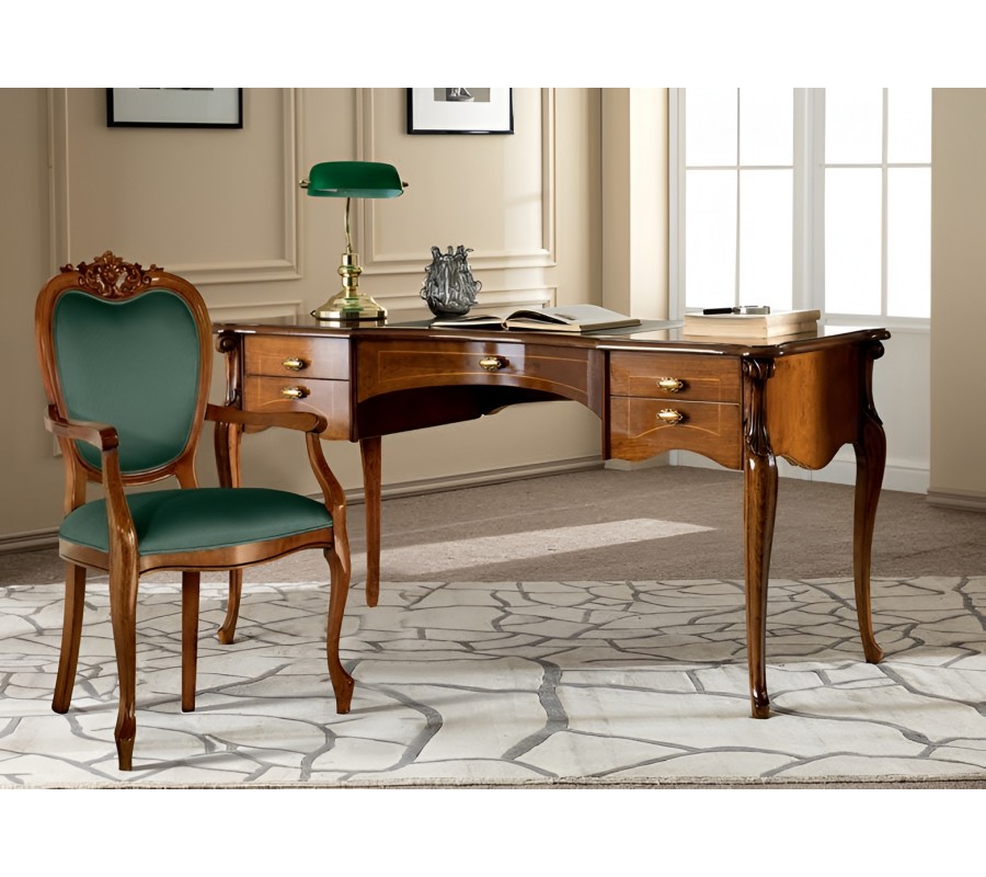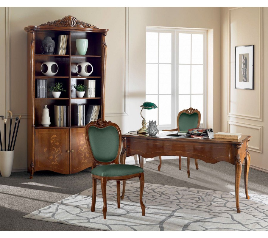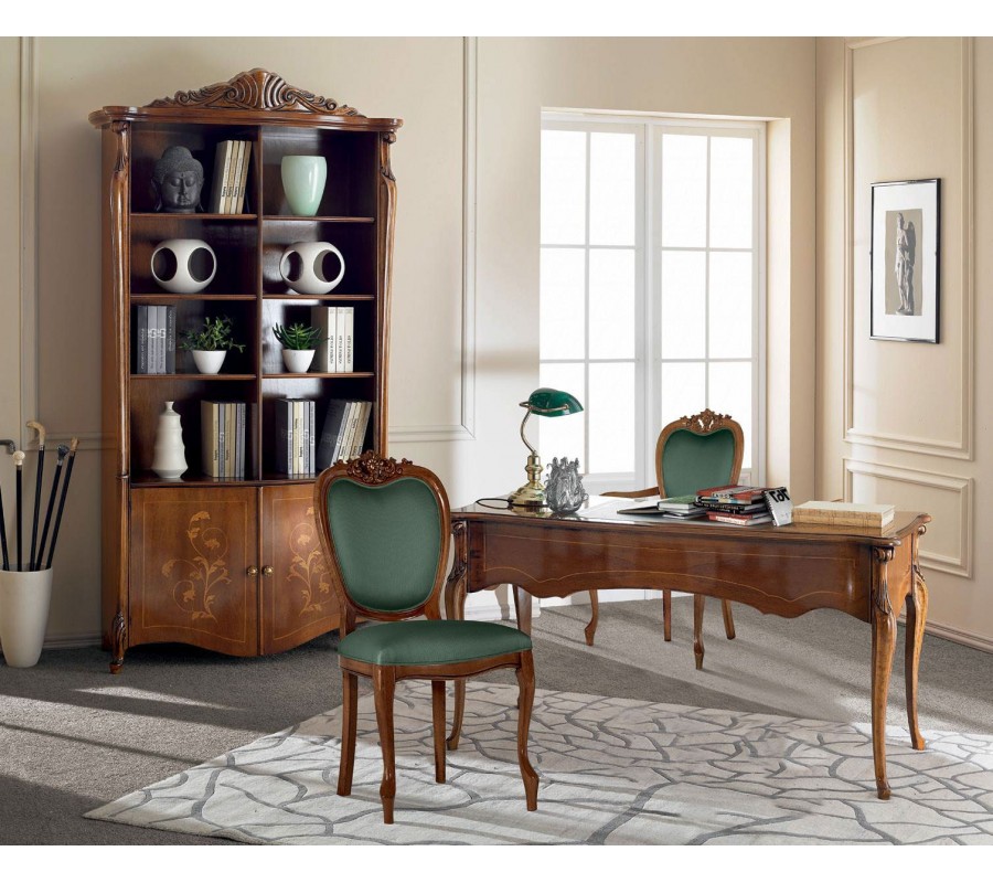 Celá zostava pôsobí mimoriadne honosne, pričom zachováva praktickosť – písací stôl ponúka zásuvky s úložným priestorom a knižnica poskytuje dostatok miesta na knihy, dekorácie či archívne materiály. Obe stoličky kombinujú pohodlie s estetickým dojmom vďaka kvalitnému čalúneniu a premysleným ergonomickým proporciám.
