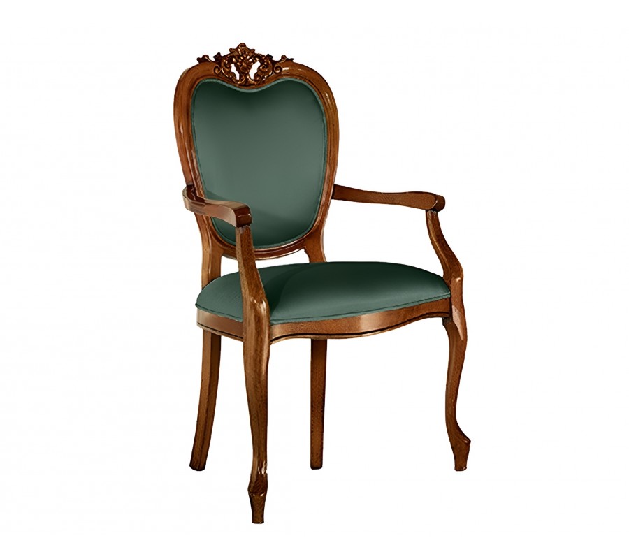 V zostave nájdete čalúnené stoličky s opierkami, stoličky bez opierok, pracovný písací stôl a vysokú knižnicu – všetko v harmonickej kombinácii masívneho dreva s jemným dekoratívnym vyrezávaním. Teplý hnedý odtieň dreva dopĺňa klasický charakter nábytku, ktorý pôsobí robustne, elegantne a zároveň reprezentatívne.