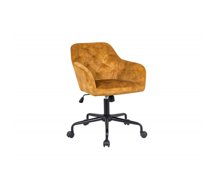Jedinečná kancelárska stolička Berthe vás na prvý pohľad zaujme výraznou farbou a prešívaním čalúnenia. Jednoduchý tvar je doplnený dekoratívnym prešívaním v obľúbenom Chesterfield štýle, ktorý vďaka zamatovému poťahu získava nezameniteľný pôvab luxusu. Pohodlie je vďaka čalúneným opierkam na ruky zachované aj počas dlhšieho sedu. Čalúnená časť stoličky je doplnená modernou kovovou kancelárskou konštrukciou, ktorá je výškovo polohovateľná a doplnená praktickými kolieskami. Tento štýlový kúsok môžete kombinovať s masívnym nábytkom či kovovými prvkami vo vašej luxusnej pracovni. Skvele vynikne aj v moderných priestoroch s klasickými štýlovými prvkami.