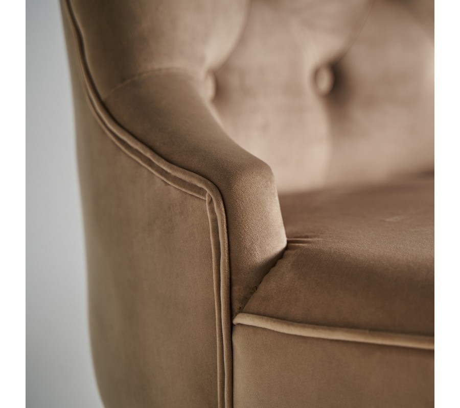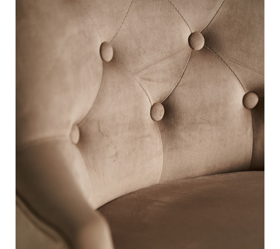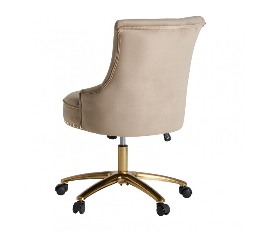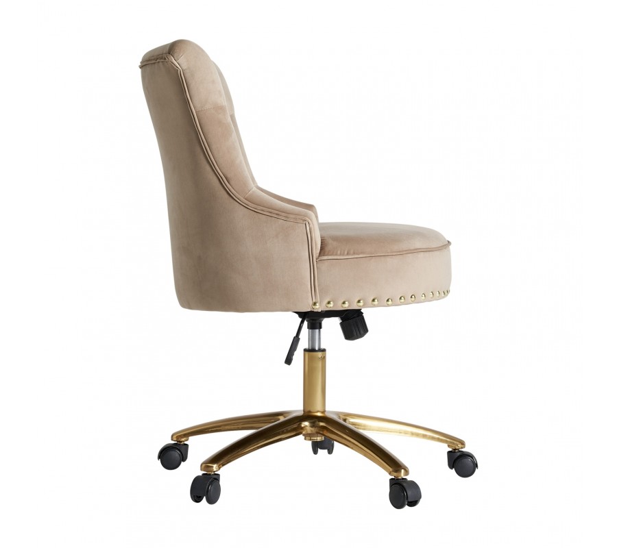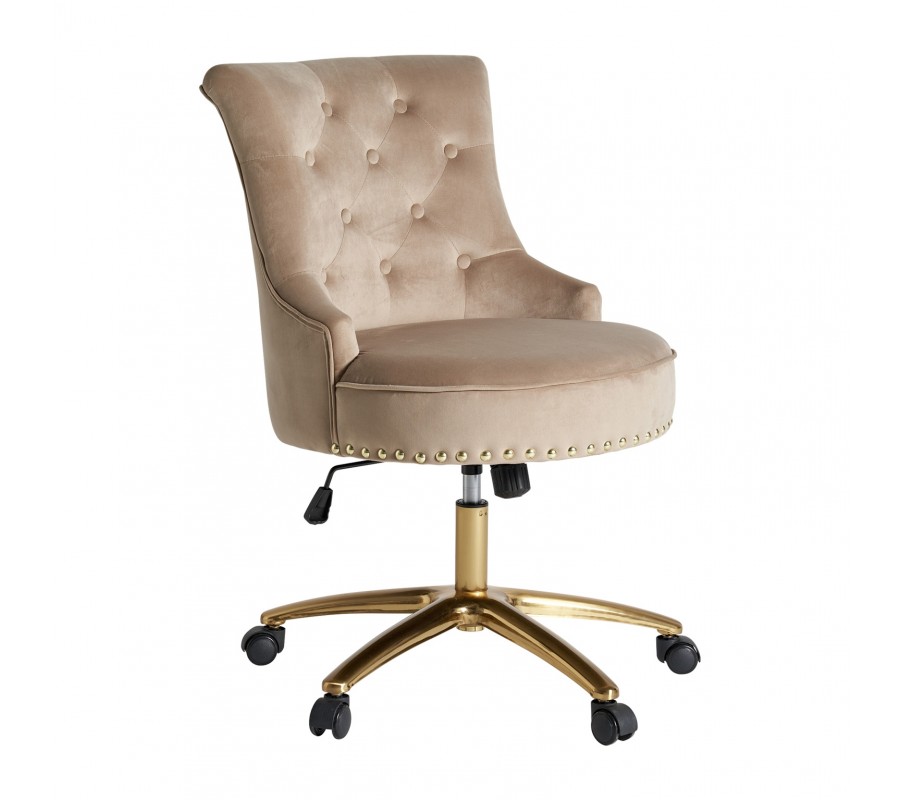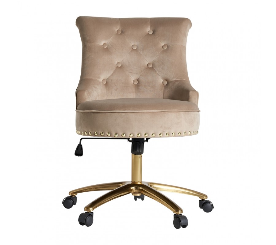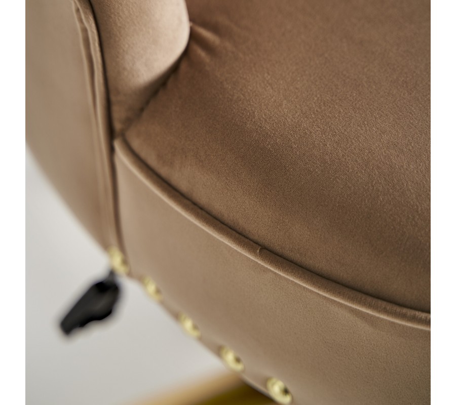 Dizajnová otočná kancelárska stolička Portkey vkusne doplní každú modernú či art-deco ladenú pracovňu, kanceláriu alebo študentskú izbu. Elegantný vzhľad tohto kúsku je dosiahnutý príjemným okrúhlym tvarom sedacej časti a tvarovaným operadlom, ktoré vám zaručí stopercentný komfort. Zamatové čalúnenie kresla sa nesie v jemnej latte farbe a zdobí ho nadčasové chesterfield prešívanie. Kontrast k jemnému poťahu tvorí kovová konštrukcia nožičiek zlatej farby, vďaka ktorej dostáva stolička nezameniteľný art-deco nádych. Luxusný nádych dodávajú tiež kovové cvoky zlatej farby na spodnom okraji. Mechanizmus konštrukcie umožňuje ľahké otáčanie a nastavenie výšky. Koliečka zasa zjednodušujú manipuláciu a stolička Portkey je tak praktickým a vizuálne zaujímavým doplnkom všetkých moderných priestorov. Odporúčame ho kombinovať s nábytkom z kovu či masívneho dreva a výraznými zlatými doplnkami.