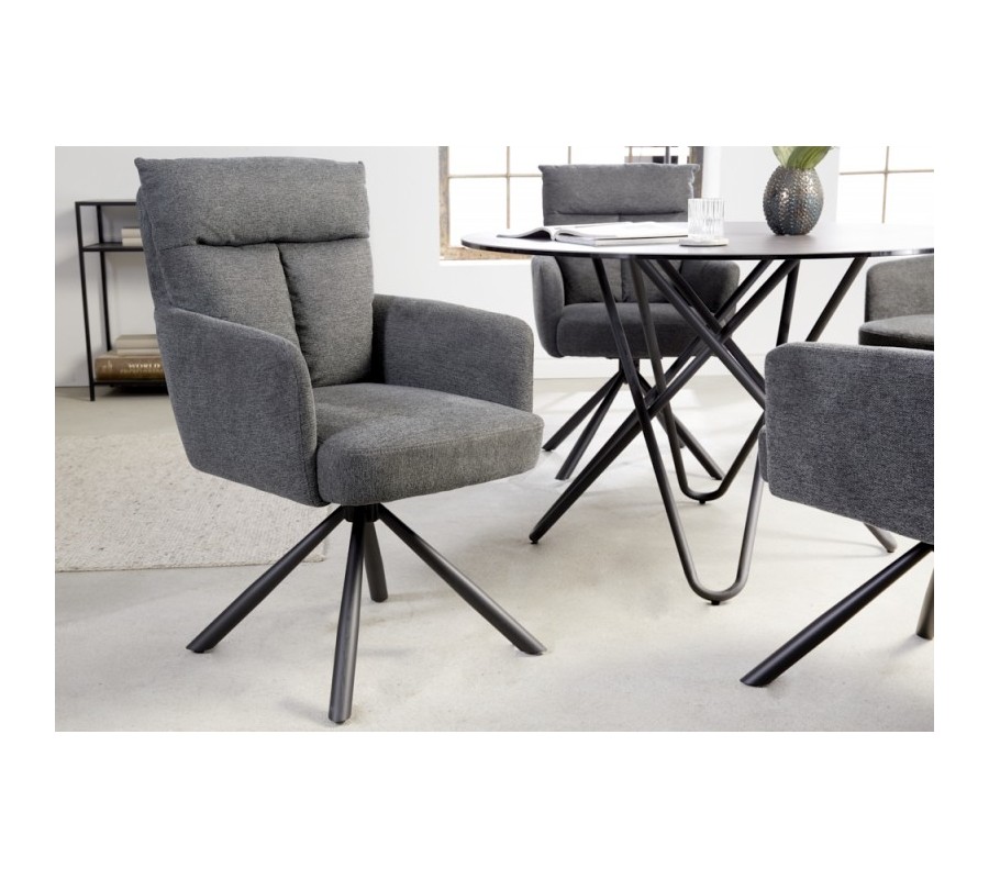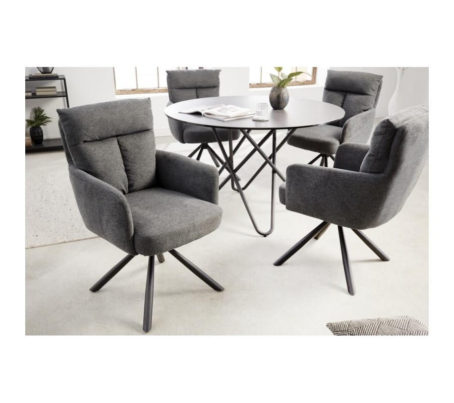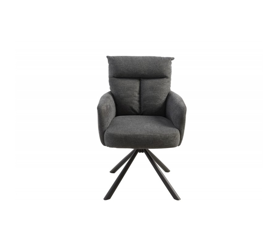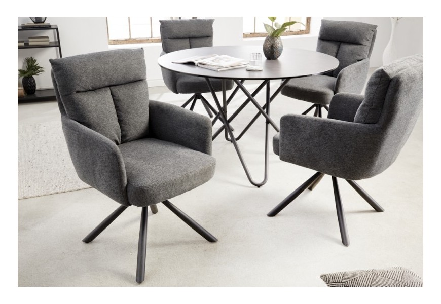 Štýlová stolička Dover predstavuje unikátny kúsok s nádychom retro štýlu, ktorý dizajnovo doplní vaše moderne ladené priestory. Jednoduchý vzhľad a dôraz na funkčnosť z nej robia vynikajúcu voľbu pri práci alebo stolovaní. Praktická funkcia otáčania o 360 stupňov poteší najmä v kancelárii či študentskej izbe, kde oceníte flexibilitu pohybu. Stolička disponuje mäkkým pohodlným čalúnením v tmavosivej farbe s elegantným prešívaním na operadle. Okrem jemného tvarovania uspôsobenému k pohodlnému sedeniu oceníte aj praktické podrúčky. Retro vzhľad je doplnený šikmými čiernymi nohami z kovu. Vďaka univerzálnej tmavej farebnosti je stolička Dover skvelo kombinovateľným doplnkom, ktorý si svoje miesto nájde okrem súkromných interiérov aj v priestoroch štýlových reštaurácií, hotelov či zasadacích miestností. Dá sa vhodne kombinovať nielen s prvkami retro štýlu ale aj v moderných a industriálne ladených priestoroch.