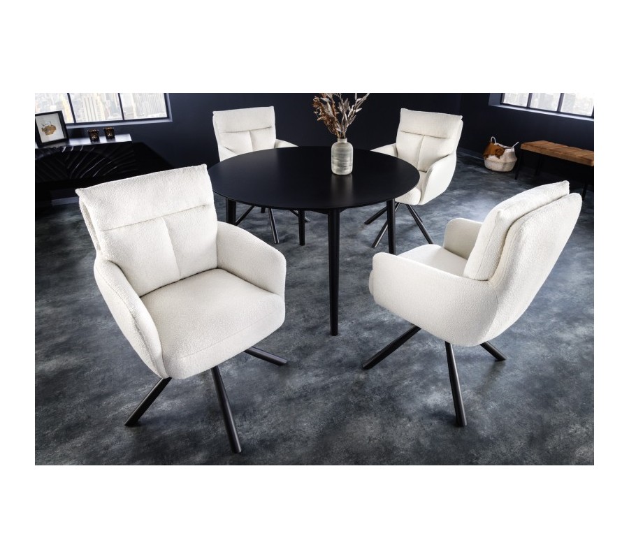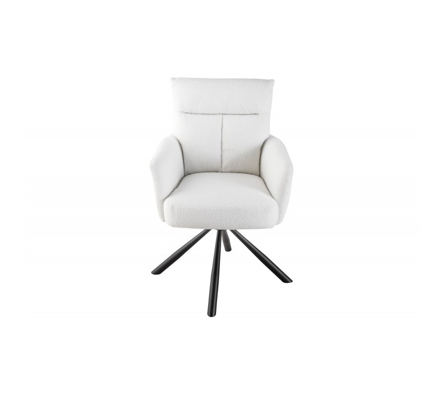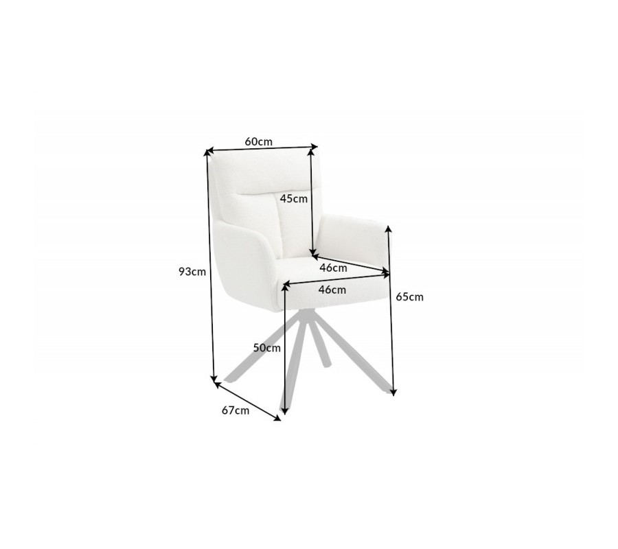 Štýlová stolička Dover je praktickým a esteticky príťažlivým doplnkom vhodným na zariadenie jedální, pracovní či iných spoločenských miestností. Vďaka svojmu univerzálnemu prevedeniu je skvelým spoločníkom či už pri práci, štúdiu alebo pri stolovaní. Praktická funkcia otáčania sedacej časti o 360 stupňov poteší všetkých, ktorí ocenia flexibilitu pohybu. So stoličkami Dover nemusíte robiť žiadne kompromisy. Vaše pohodlie a komfort je na prvom mieste a postará sa oň mäkké prešívané čalúnenie a praktické podrúčky. Poťah v elegantnej bielej farbe krásne rozžiari najmä tmavšie ladené priestory. Naopak v svetlejších miestostiach zdôrazní minimalistický moderný štýl. Kontrastným prvkom sú industriálne ladené čierne nožičky z kovu, ktoré svojím zaujímavým zošikmením umocňujú jemný retro nádych stoličky. Farebná aj materiálová kombinácia robia zo stoličky Dover univerzálny a ľahko kombinovateľný kúsok, ktorý možno umiestniť nielen do retro, ale aj industriálne a moderne ladených priestorov.