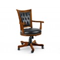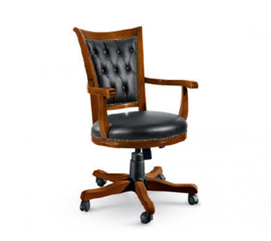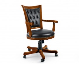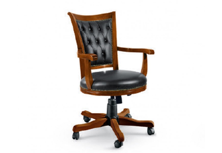 Luxusné rustikálne pracovné kreslo z masívneho dreva v hnedej farbe na kolieskach s čiernym koženým čalúnením a s možnosťou polohovania predstavuje perfektnú kombináciu štýlu, pohodlia a funkčnosti. Je ideálnym riešením pre každého, kto hľadá pracovné kreslo, ktoré je nielen pohodlné a praktické, ale tiež esteticky príťažlivé a v súlade s rustikálnym dizajnom interiéru.