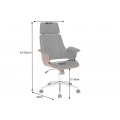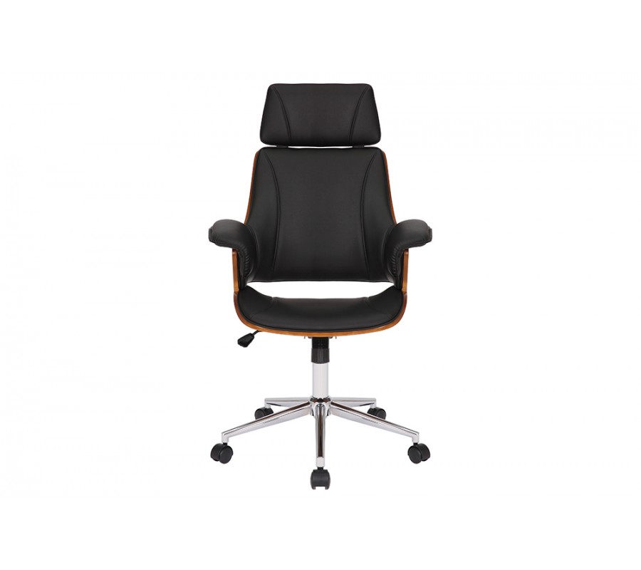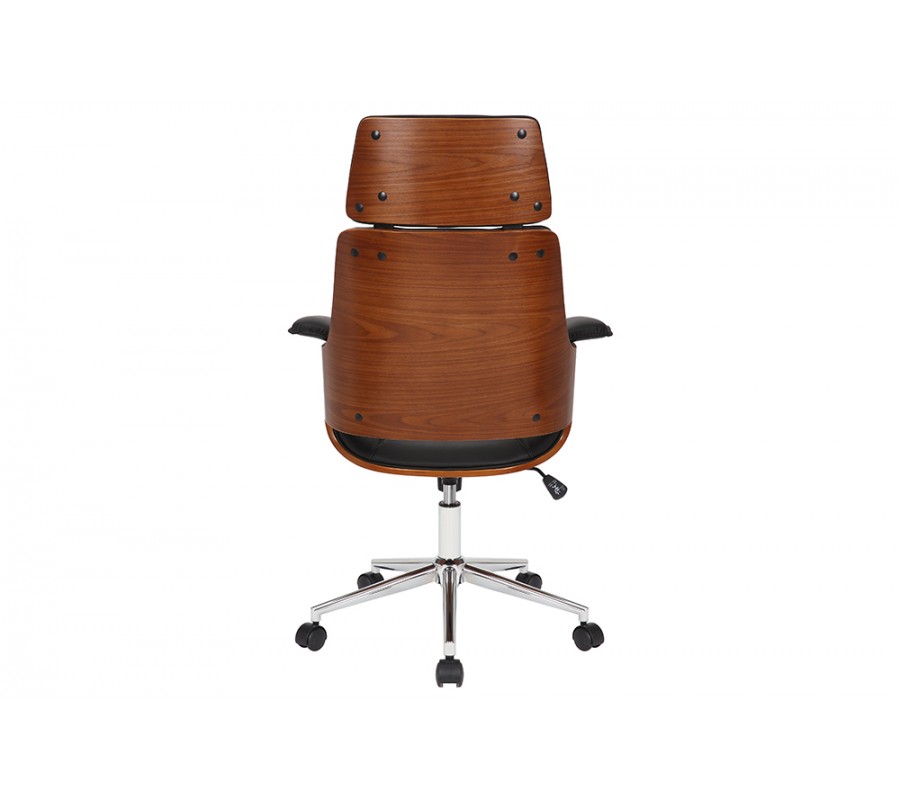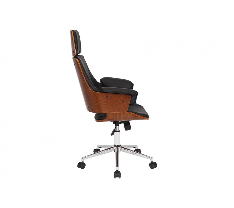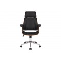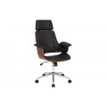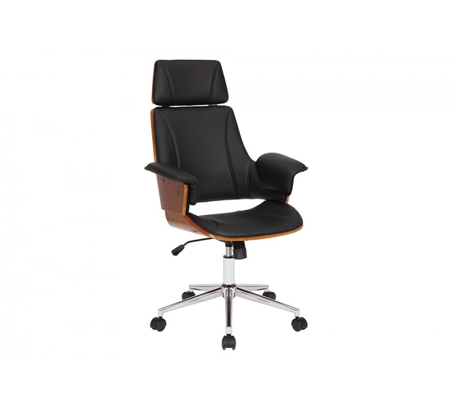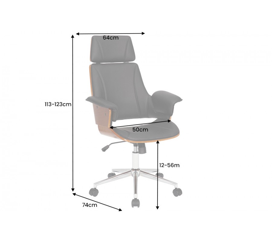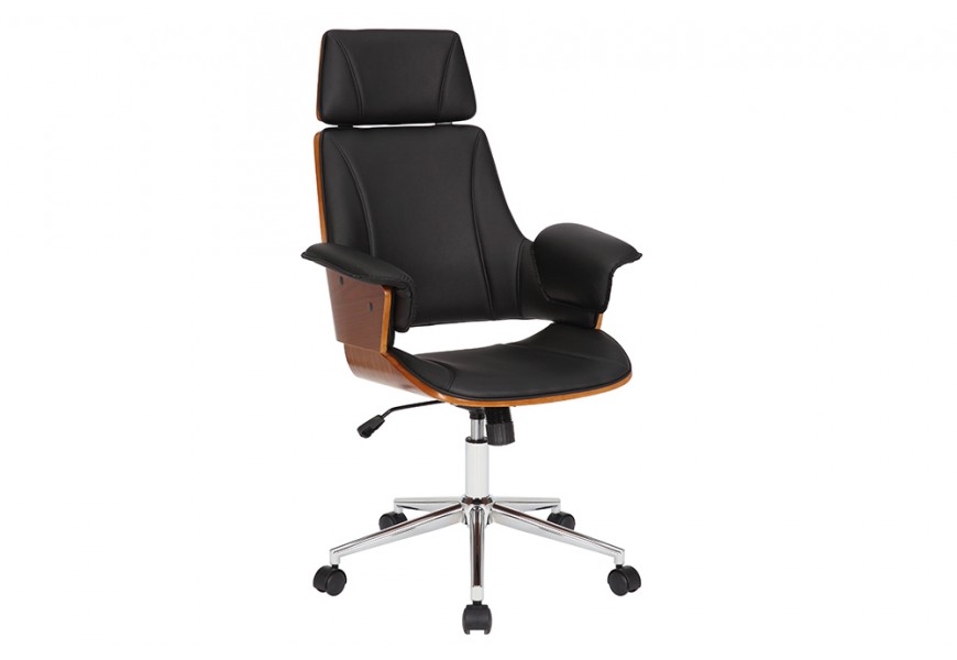 Otočná kancelárska stolička Madison v sebe spája štýlový retro dizajn a maximálny komfort a funkcionalitu. Vysoká chrbtová opierka a opierka na hlavu vám zaručia pohodlné sedenie aj počas dlhých a náročných pracovných dní. Stolička je tiež výškovo nastaviteľná, pomocou páčky umiestnenej pod sedacou časťou. Čalúnenie z ekokože jej dodáva príjemnú mäkkosť a zároveň je tiež výrazným vizuálnym prvkom, ktorý vďaka čiernej farbe pôsobí luxusným a sofistikovaným dojmom. Vytvára estetický kontrast s vonkajšími stranami sedacej časti, na ktorých je viditeľná drevená konštrukcia z ohýbaného orechového dreva s prírodnou kresbou. Stoličke tak dodáva prírodný nádych s zároveň zvyšuje jej pevnosť. Stolička je postavená na chrómovej kovovej nohe s piatimi kolieskami s čiernymi detailmi. Lesklý materiál ešte zvyšuje štrukturálnu rozmanitosť dizajnu. Bočné opierky na ruky dodávajú stoličke mohutný vzhľad, vďaka čomu sa stane dôstojný stredobodom vašej kancelárie či domácej pracovne. Vďaka dreveným prvkom sa skvele sa hodí k pracovnému stolu z tmavého dreva, ktorý môžete tiež doplniť podobnou knižnicou či regálom. Do pracovne môžete tiež pridať koženú sedačku, čím dodáte miestnosti luxusný vzhľad. Ak hľadáte pohodlie, funkčnosť a štýlový dizajn, kancelárska stolička Madison je presne pre vás.