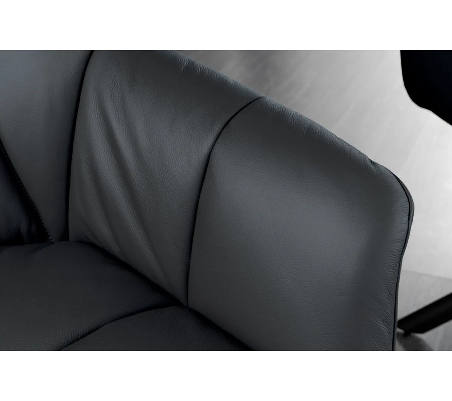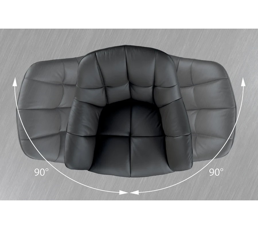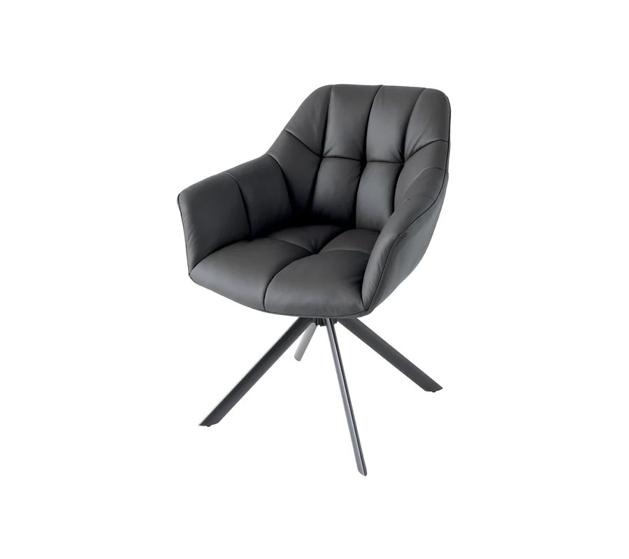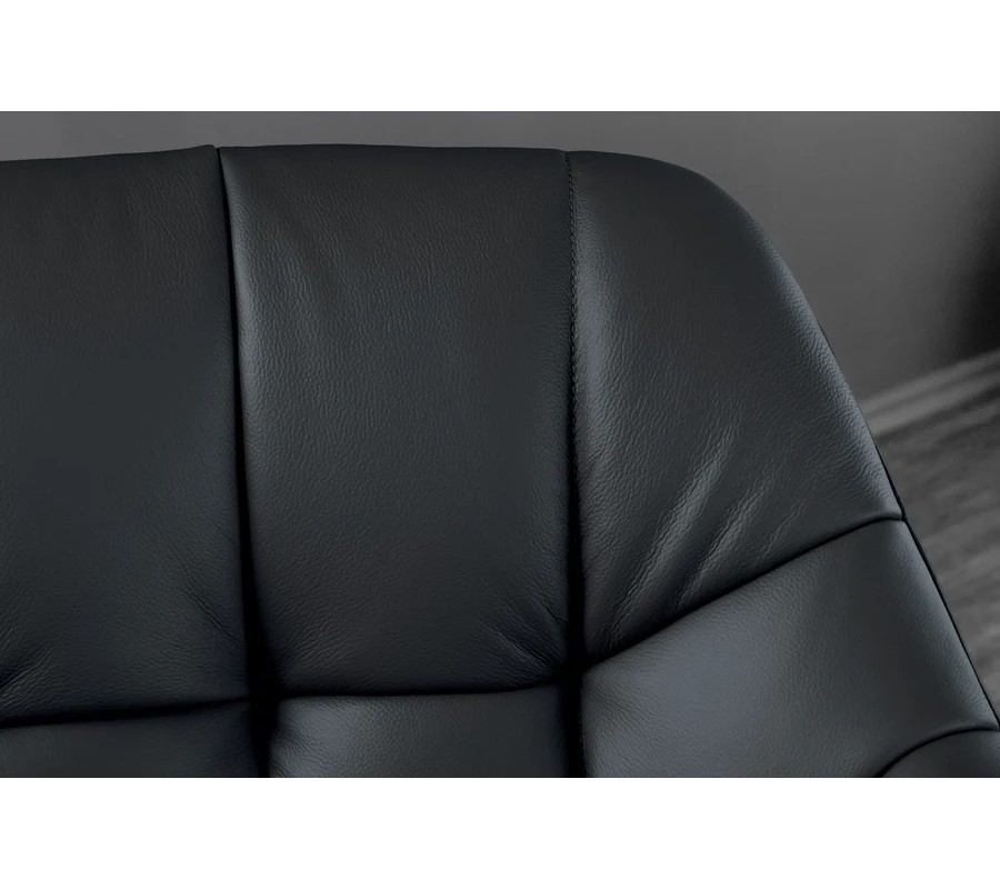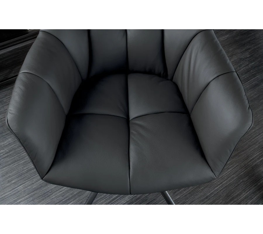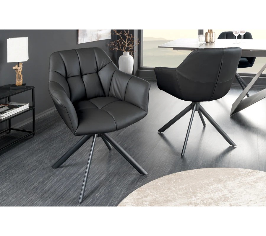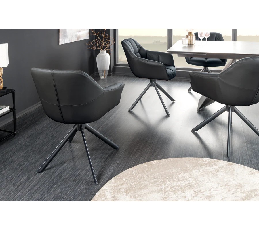 Otočná jedálenská stolička s luxusným vzhľadom je potiahnutá hladkou čiernou kožou, ktorá dodáva povrchu elegantný a sofistikovaný dojem. Sedák a opierka sú čalúnené a zdobené jemným prešívaním, ktoré vytvárajú geometrický vzor, zvyšuje pohodlie a pridáva vizuálnu hĺbku.
