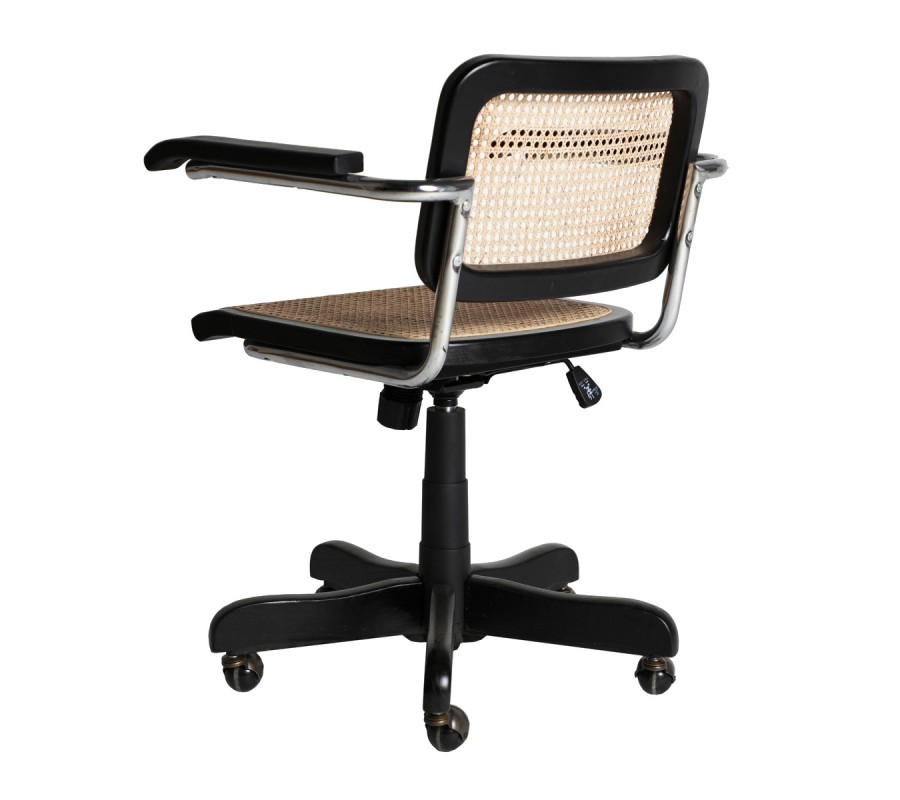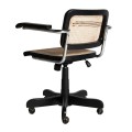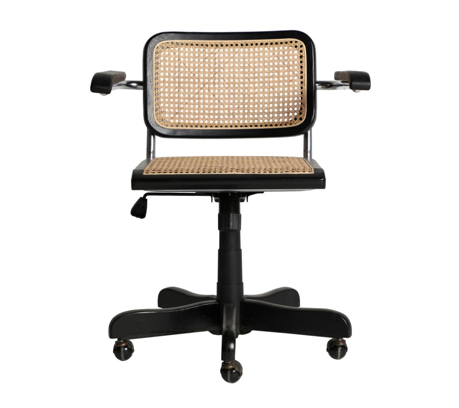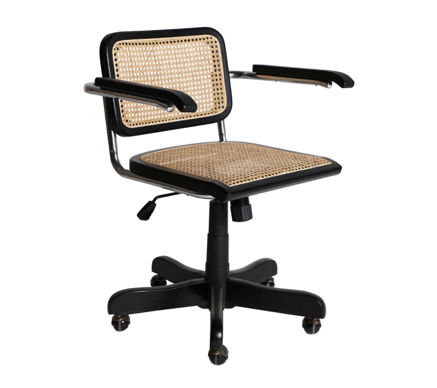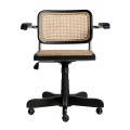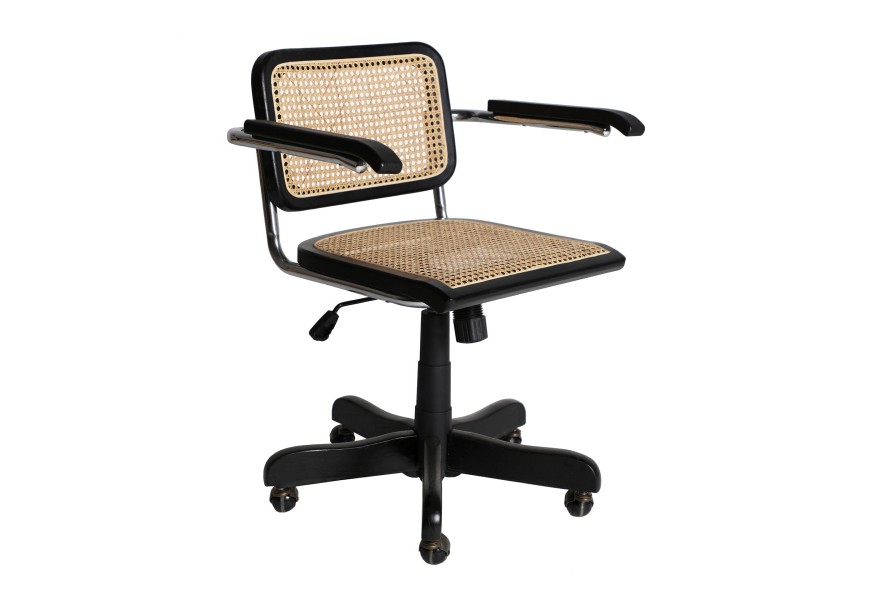 Ak hľadáte do svojej kancelárie dizajnovo zaujímavé a funkčné kreslo, ste na správnom mieste! Kreslo Moher zaujme svojím štýlovým prevedením prepájajúcim prvky moderného a industriálneho štýlu. Vyznačuje sa však aj svojím funkčným a praktickým dizajnom, ktorý vám spríjemní a uľahčí čas strávený v kancelárii. Kreslo sa nesie v čiernej farbe a pozostáva z konštrukcie kombinujúcej materiál dreva a kovu. Na sedacej časti a operadle kovový rám vypĺňa dizajnový ratanový viedenský výplet svetlohnedej farby, ktorý do dizajnu vnáša jemný naturálny nádych. Praktické podrúčky dotvárajú originálny dizajn a zároveň dopomôžu k vášmu dokonalému pohodliu. Každý, kto v pracovni denne trávi dlhé hodiny, určite uvíta aj možnosť nastavenia výšky a praktické koliečka, ktoré uľahčujú pohyb a manipuláciu. Moderné prevedenie kresla Moher vkusne doplní tmavý masívny alebo kovový kancelársky stôl a vo vašich priestoroch vytvorí unikátny industriálny nádych. Umocniť ho môžete kombináciou s doplnkami z prírodných materiálov či ďalším nábytkom využívajúcim ratanový výplet.