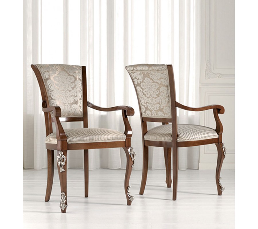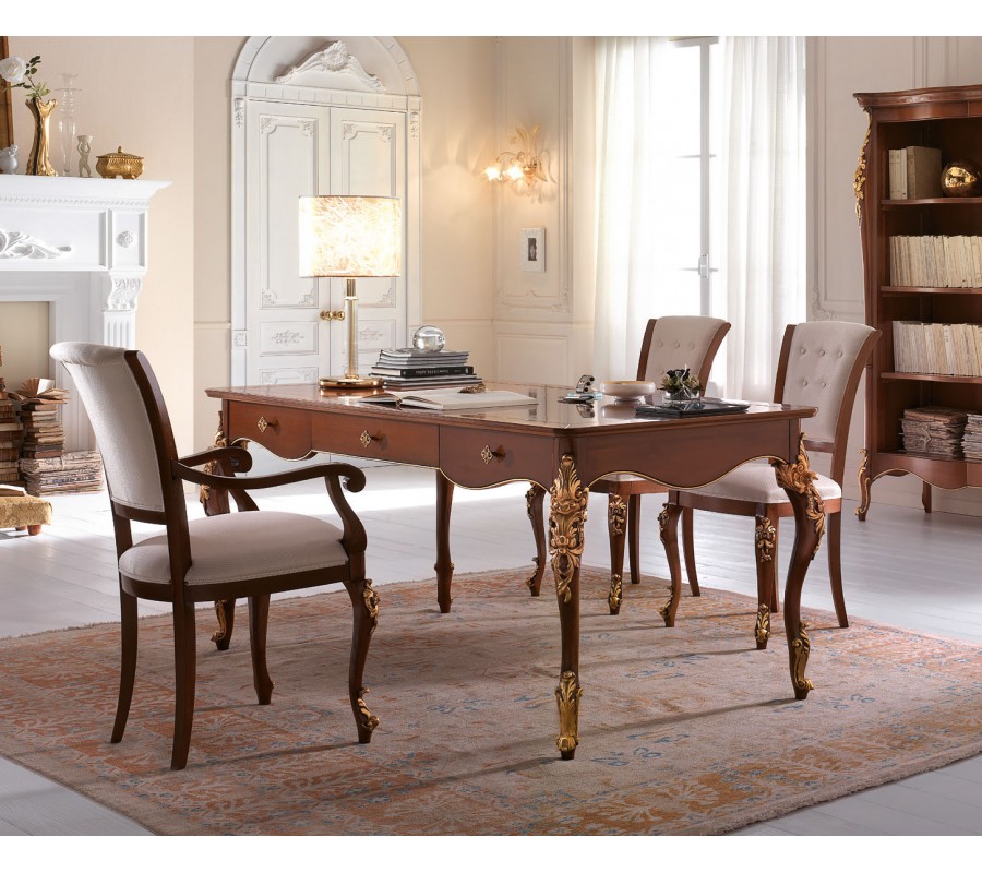 Sedák aj operadlo sú vybavené mäkkým čalúnením, ktoré zaručuje pohodlie počas dlhých hodín práce alebo štúdia. Zdobenie na čalúnení pridáva stoličke sofistikovaný a elegantný vzhľad, čo ju robí výrazným doplnkom v každej pracovni alebo domácej kancelárii. Nožičky stola sú bohato zdobené ručným vyrezávaním, tvarované v štýle cabriolových nožičiek (cabriole legs) ktoré boli obľúbené najmä v minulých storočiach a celkovo stolu dodávajú historizujúci starožitný barokový nádych.