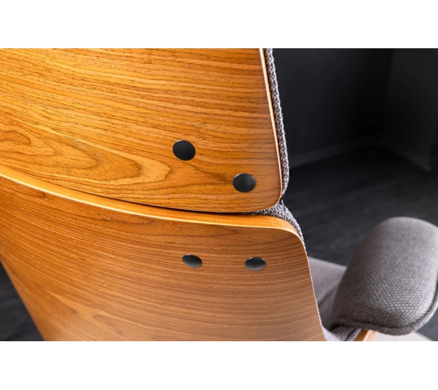 Vonkajšia strana stoličky je spevnená plnou konštrukciou z pravej orechovej dyhy v naturálnom teplom hnedom odtieni s výraznou kresbou letokruhov. Vnútorné strany, sedadlo a opierky na ruky sú čalúnené, s textilným poťahom z elegantnej melírovanej sivej farbe. Jeho hladká štruktúra je príjemná na dotyk a mikrovlákno mu zaručí výbornú odolnosť voči vplyvom každodenného používania.