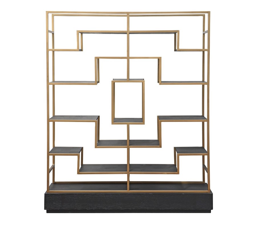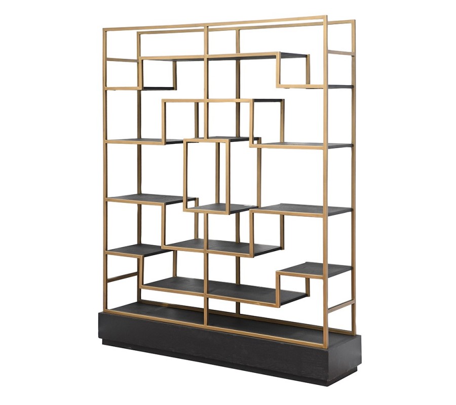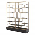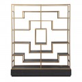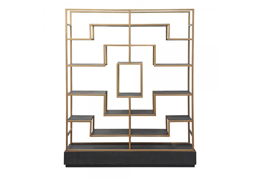 Art deco luxusný regál Emperor s kovovou konštrukciou zlatej farby s čiernymi drevenými poličkami 201cm