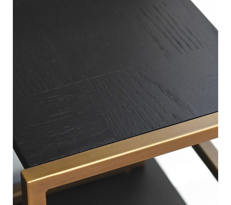 Luxusný regál z našej kolekcie Emperor predstavuje unikátny kúsok, ktorý do vašich priestorov vnesie nádych art deco štýlu. Vo svojom dizajne kombinuje kovovú konštrukciu s masívnym dubovým drevom, čím vzniká nádherný glamour efekt. Regál ponúka bohatý úložný priestor v podobe drevených poličiek nesúcich sa v čiernej farbe, pričom ich povrchovú úpravu dopĺňa zaujímavý štvorcový vzor dosiahnutý jednotlivými kúskami dreva s rôznymi smermi letokruhov ukladaných vedľa seba. Luxusná konštrukcia v zlatej farbe vytvára nezameniteľný nádych art deco štýlu a v kombinácii s čiernym masívom vzniká lukratívny kúsok vhodný do luxusných priestorov obývačiek, pracovní či spální. Zaujme tiež geometrickým usporiadaním poličiek v rôznych úrovniach, ktoré umožnia vašich dekoráciám, knihám či izbovým rastlinám naozaj vyniknúť! Vďaka vzdušnému dizajnu regál Emperor vynikne aj v menších priestoroch a môže dopomôcť k ich optickému zväčšeniu. Luxusný art deco nádych možno umocniť kombinácou s luxusnou čalúnenou sedačkou, výraznými zlatými doplnkami či dalšími kúskami z masívneho dreva, čím vo vašich priestoroch vytvoríte nádherný opulentný efekt!