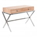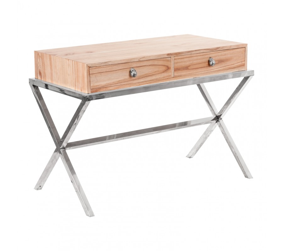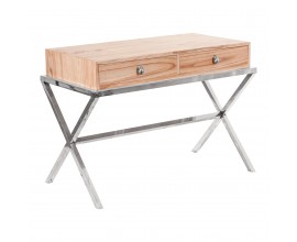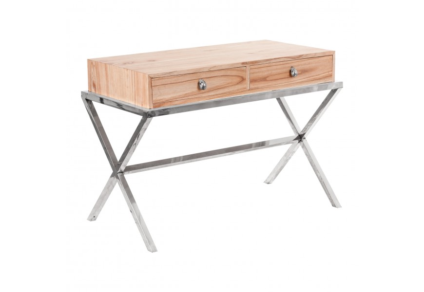 Štýlový písací stôl CHROME je tým pravým doplnkom moderne zariadených, svetlých priestorov s nádychom luxusu. Stolík tvorí jednoduché telo v materiálovej kombinácii svetlého dreva a strieborného kovu. Jednoduché a čisté tvary tohto stola obohacujú dve zásuvky s úchytkami v podobe dvoch štýlových, kovových lebiek.