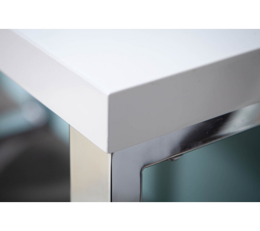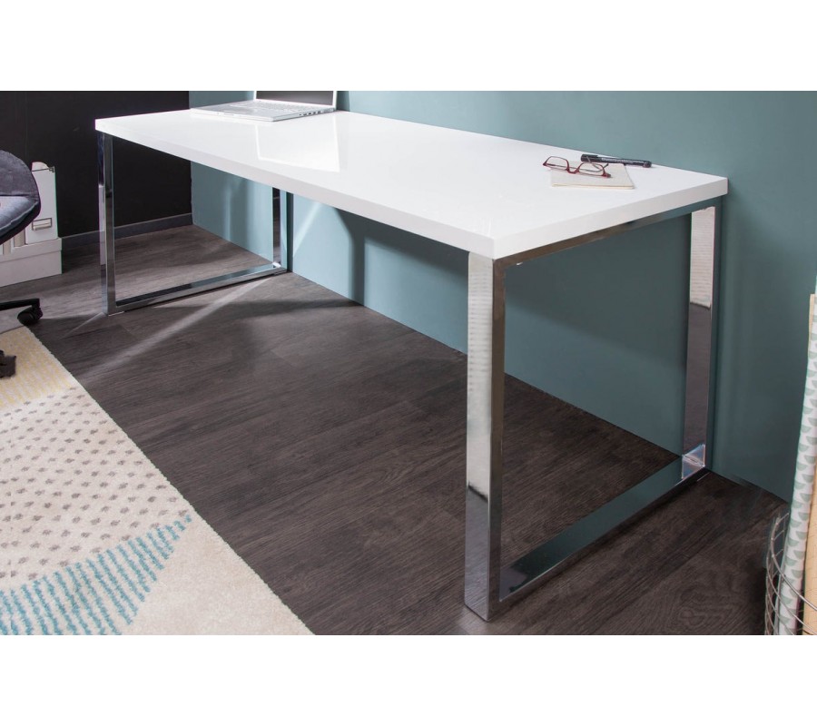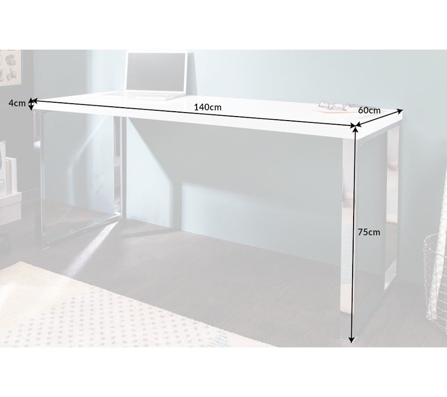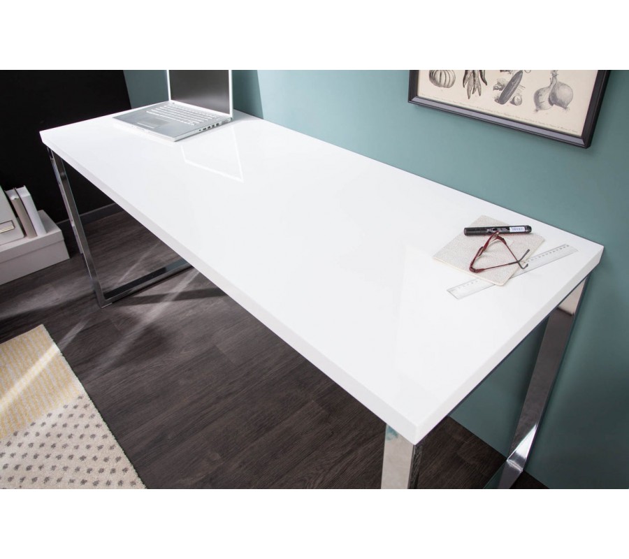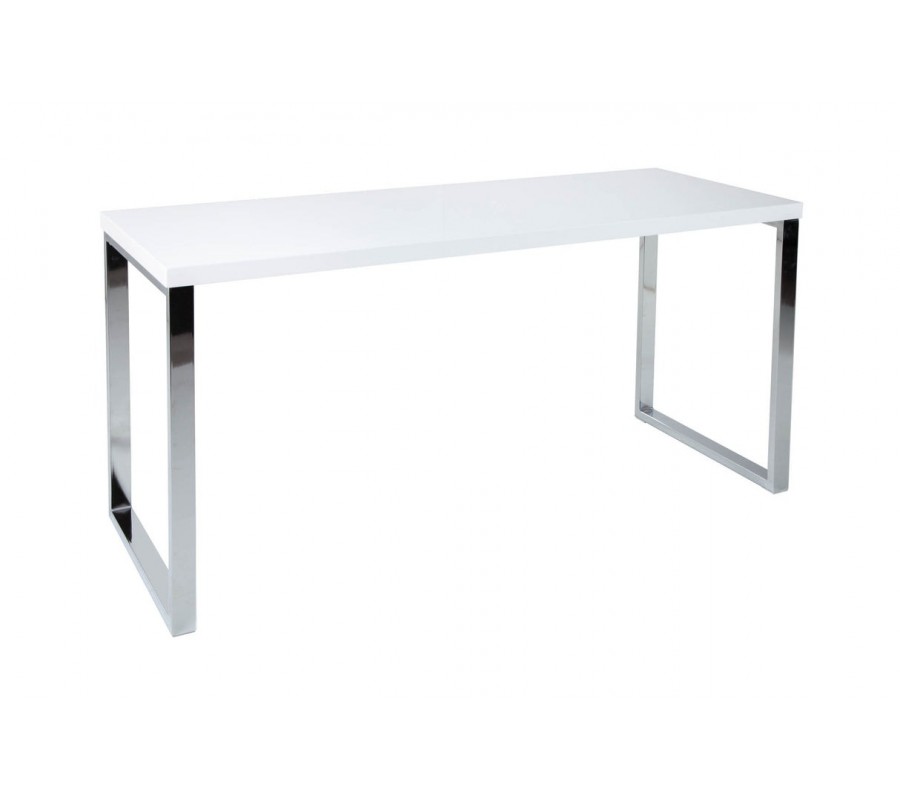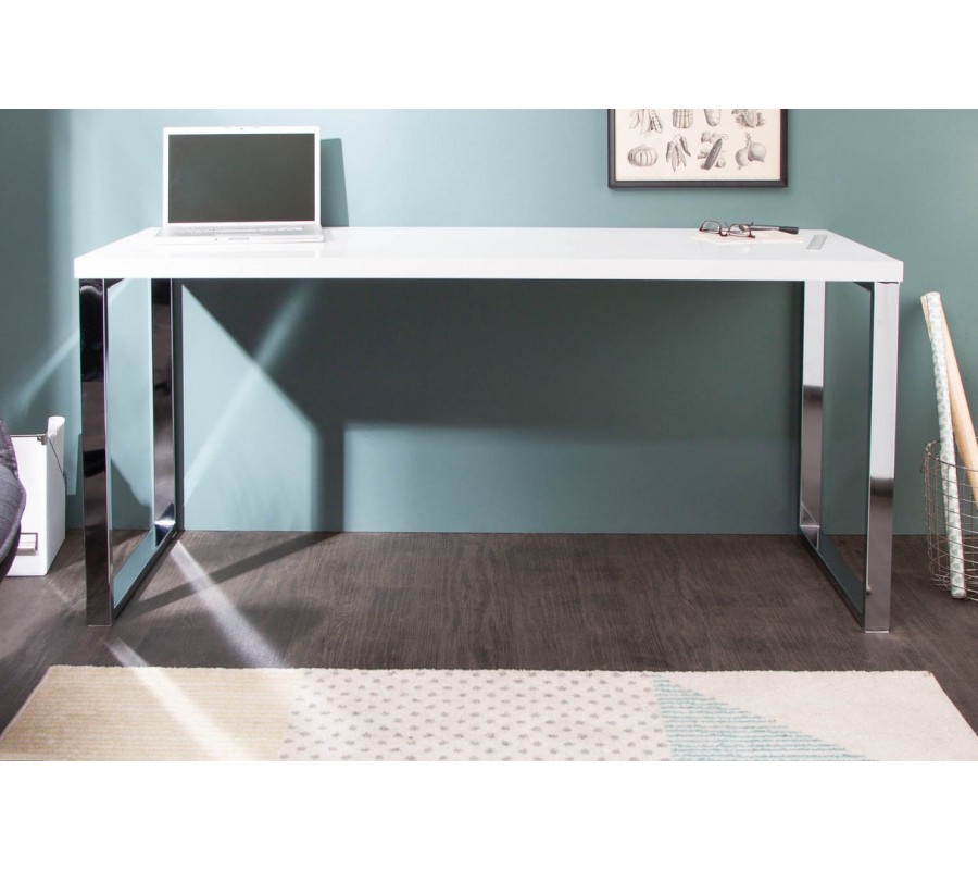 Moderný obdĺžnikový biely písací stôl White Desk s lesklou doskou a hranatými striebornými kovovými chrómovými nohami 140 cm