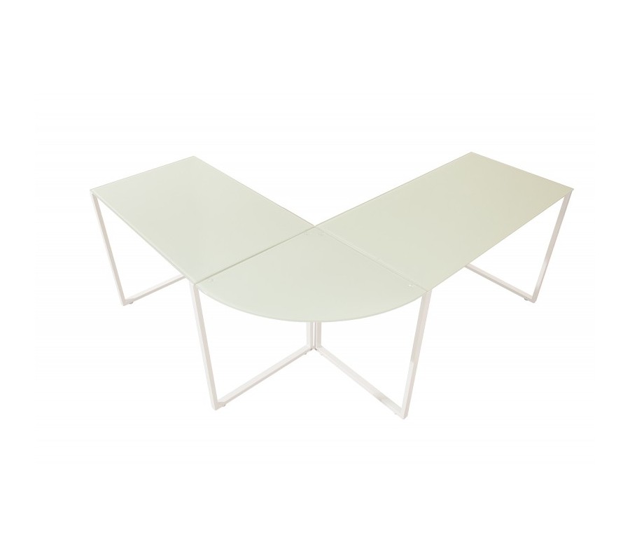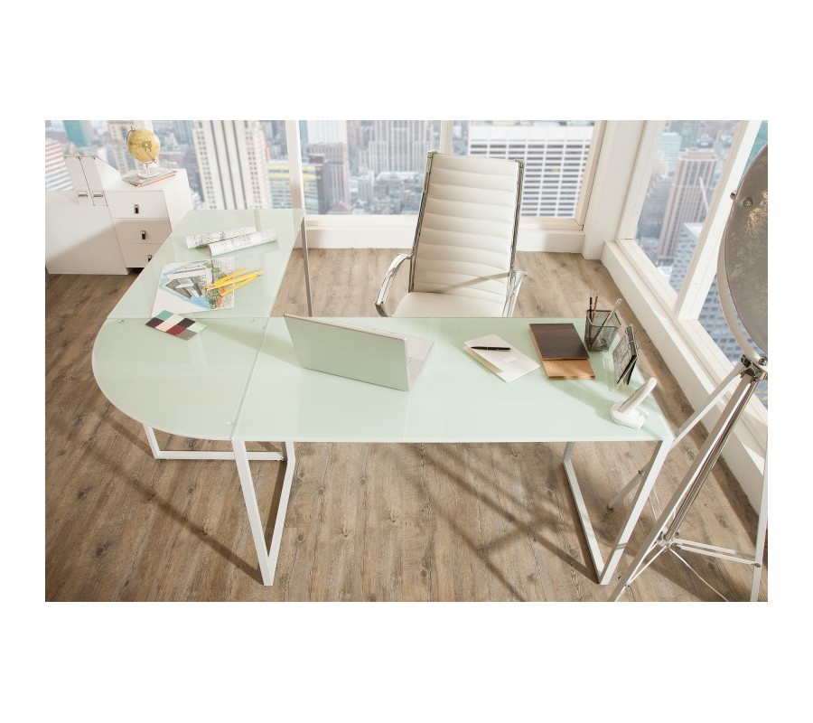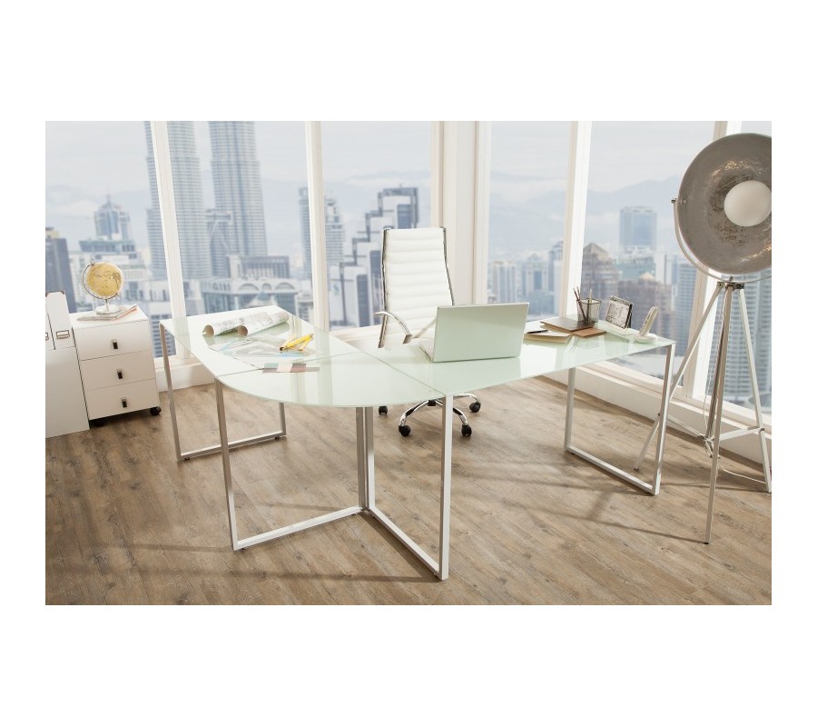 Jedinečný moderný kancelársky stôl Mayer je vyrobený zo skla. a kovu. Originálny je najmä vďaka svojmu zaoblenému tvaru a veľkosti, ktorá vám poskytuje bohaté miesto na prácu a kancelárske potreby. Vďaka bielej farbe kovovej konštrukcie je veľmi ľahko kombinovateľný so širokou škálou farieb, avšak v kombinácii s bielym nábytkom vytvorí dokonalý súlad. Skvelo sa hodí do moderného interiéru a vašu pracovňu zaručene rozžiari.