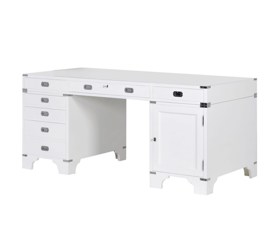Luxusný kancelársky stolík Wielton Blanc je skvelou voľbou pre každého, kto má rád čistý dizajn a zároveň originálne a kvalitné prevedenie. Je vyrobený z kombinácie masívneho dreva a MDF, vďaka čomu má skvelú stabilitu a životnosť. Lesklé biele prevedenie pôsobí čisto a minimalisticky, no vďaka kovovým prvkom a rukovätiam je originálnym a jedinečným. Disponuje viacerými zásuvkami a skrinkou, ktoré poslúžia na uskladnenie vašich kancelárskych potrieb či iných predmetov. Väčšia zásuvka je uzamknuteľná na kľúčik. Vďaka množstvu zásuviek je stolík Wielton Blanc veľmi praktickým riešením pre všetkých, čo majú radi všetko po ruke. Vynikne v moderne a luxusne ladených interiéroch v svetlejších farbách. Odporúčame napríklad kombináciu so zrkadlovým či chrómovým nábytkom alebo luxusnými dekoráciami z kovu.