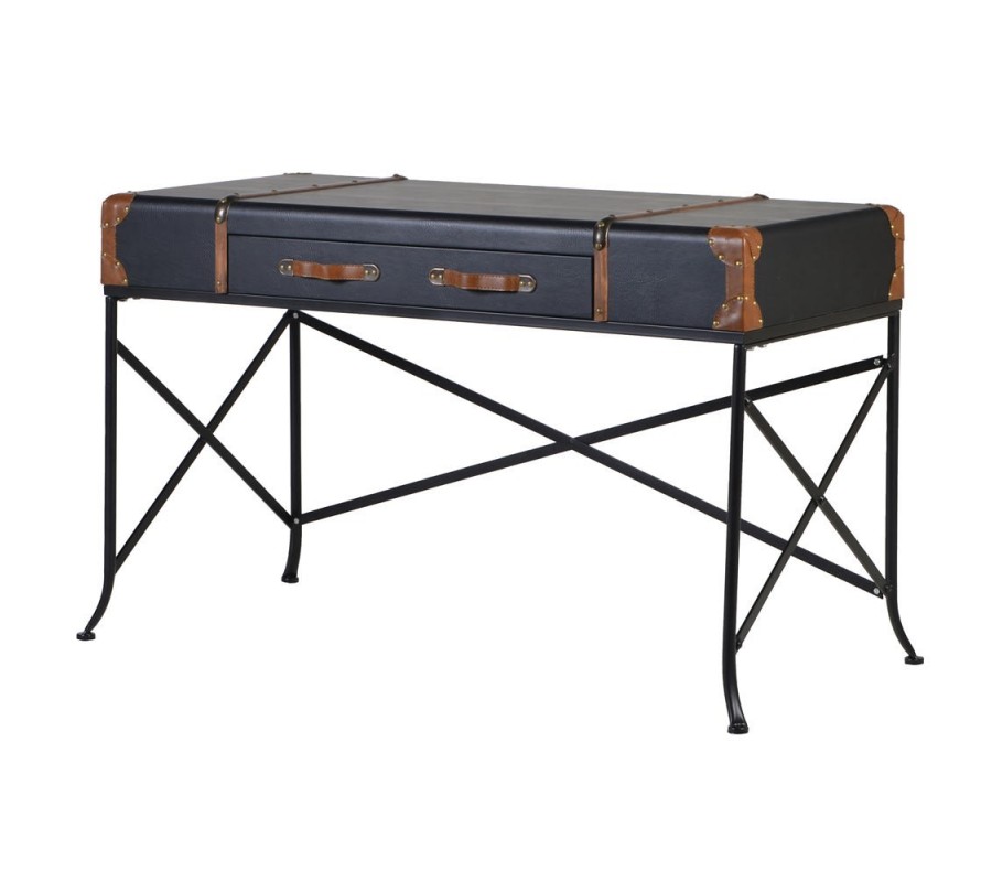 Pracovný stôl Geleo pozostáva z kovovej konštrukcie a pracovnej dosky stola s úložným priestorom. Konštrukcia v obľúbenom spojení štyroch nôh do do písmena x je vyrobená zo železa s čiernou povrchovou úpravou. Vďaka jednoduchosti tvaru a materiálu pôsobí konštrukcia stola odľahčujúcim dojmom. Pracovná doska stola nápadne pripomína tvar koženého kufra, čím v priestore navodzuje charizmatickú atmosféru koloniálneho štýlu. Povrch pracovnej dosky má kožený vzhľad a na svojich hranách je doplnený pratickými a dekoratívnymi chráničmi z eko kože. Okrem pracovnej plochy je súčasťou stola aj praktický úložný priestor v podobe širokej zásuvky. Úchyty uľahčujúce manipuláciu pri odkladaní predmetov a drobné dekoračné prvky sú vyrobené z hnedej eko kože. Pracovný stolík Geleo je ideálnym kúskom do koloniálnych pracovní či knižníc s dreveným nábytkom a koloniálnymi doplnkami dýchajúcimi históriou.
