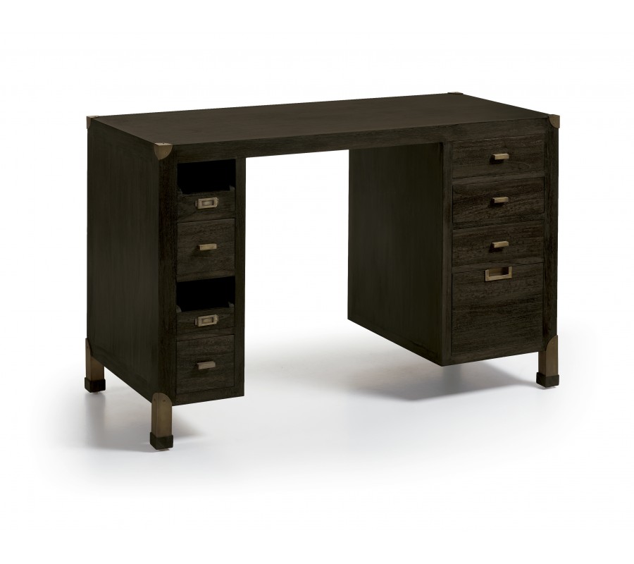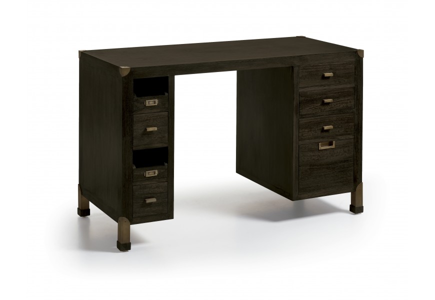 Luxusný štýlový písací stôl so zásuvkami z kolekcie M-INDUSTRIAL je vyrobený z masívneho koloniálneho dreva MINDI. Kovové rohové prvky, ako aj úchyty či nožičky dávajú nábytku zaujímavý industriálny nádych. Štýlová čierna farba sa hodí naozaj všade a dá sa ľahko kombinovať so širokou škálou farieb. Na povrchu dreva je vidno jeho zaujímavú kresbu, čo robí pracovný stôl M-Industrial ešte originálnejším. Disponuje viacerými praktickými zásuvkami a skrinkami, ktoré vám poskytujú dostatočný úložný priestor pre všetko, čo pri práci potrebujete. Odporúčame kombinovať s ďalšími kúskami z kolekcie M-INDUSTRIAL.