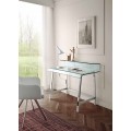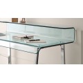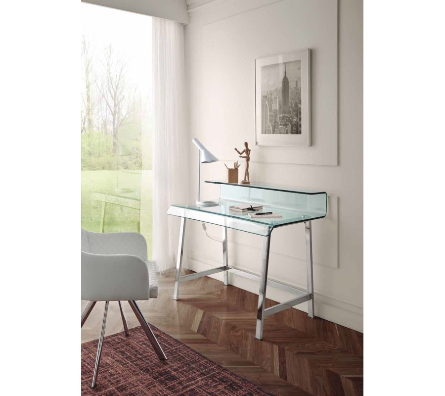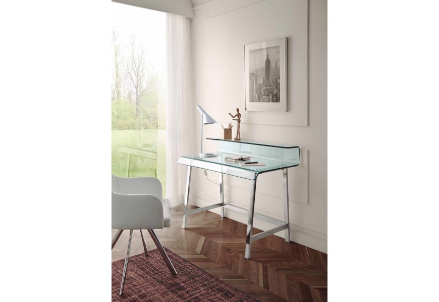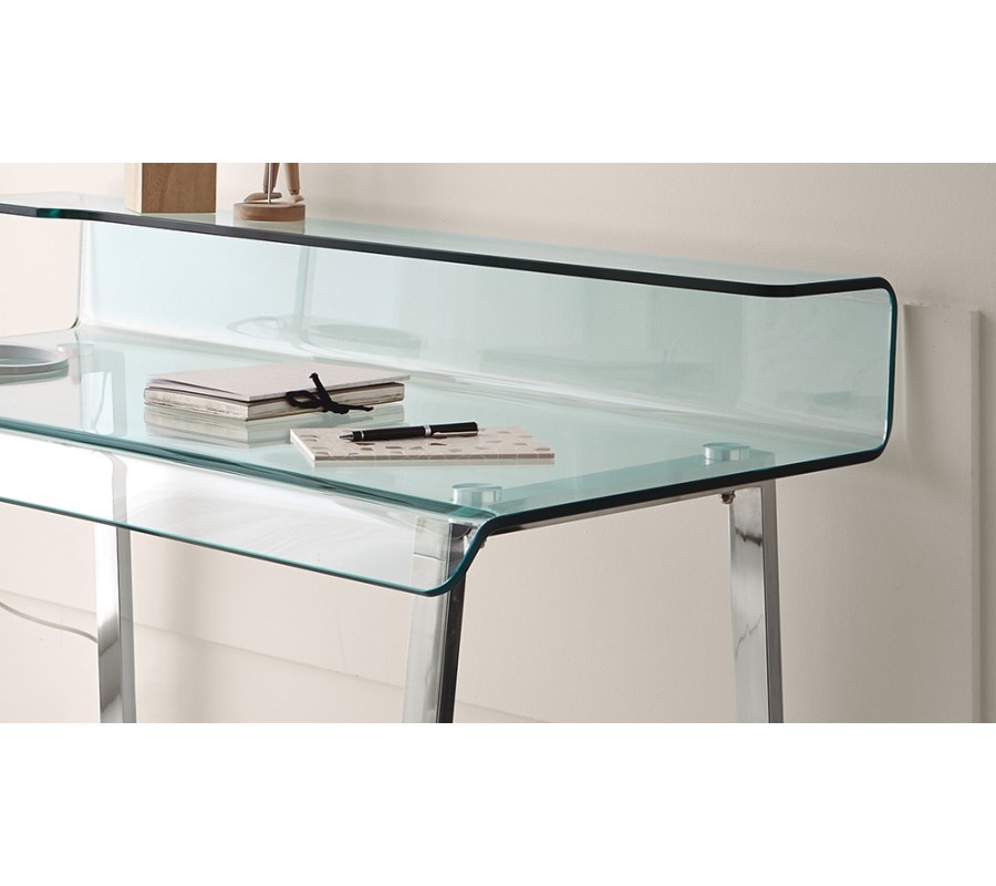 Sklenený písací stolík má dizajnovo a ergonomicky tvarovanú sklenenú priehľadnú pracovnú dosku, ktorá je stabilne usadená na chrómových nožičkách. Tvarovaná sklenená pracovná doska spolu s chrómovými nožičkami tvoria jeden kompaktný elegantný a štýlový celok. Stolík má svoju sklenenú pracovnú dosku na svojom konci prakticky zahnutú dohora, čo bráni prípadnému padaniu vecí z jeho zadnej strany. V prípade, ak si tento stolík umiestnite do spálne, tak zároveň skvele poslúži aj ako toaletný stolík.