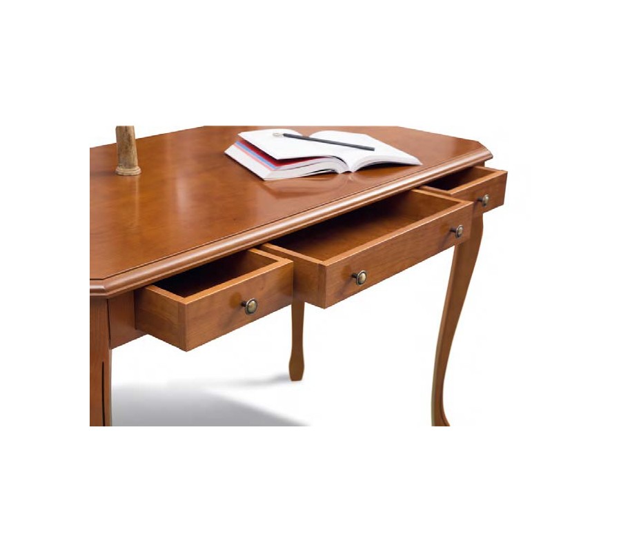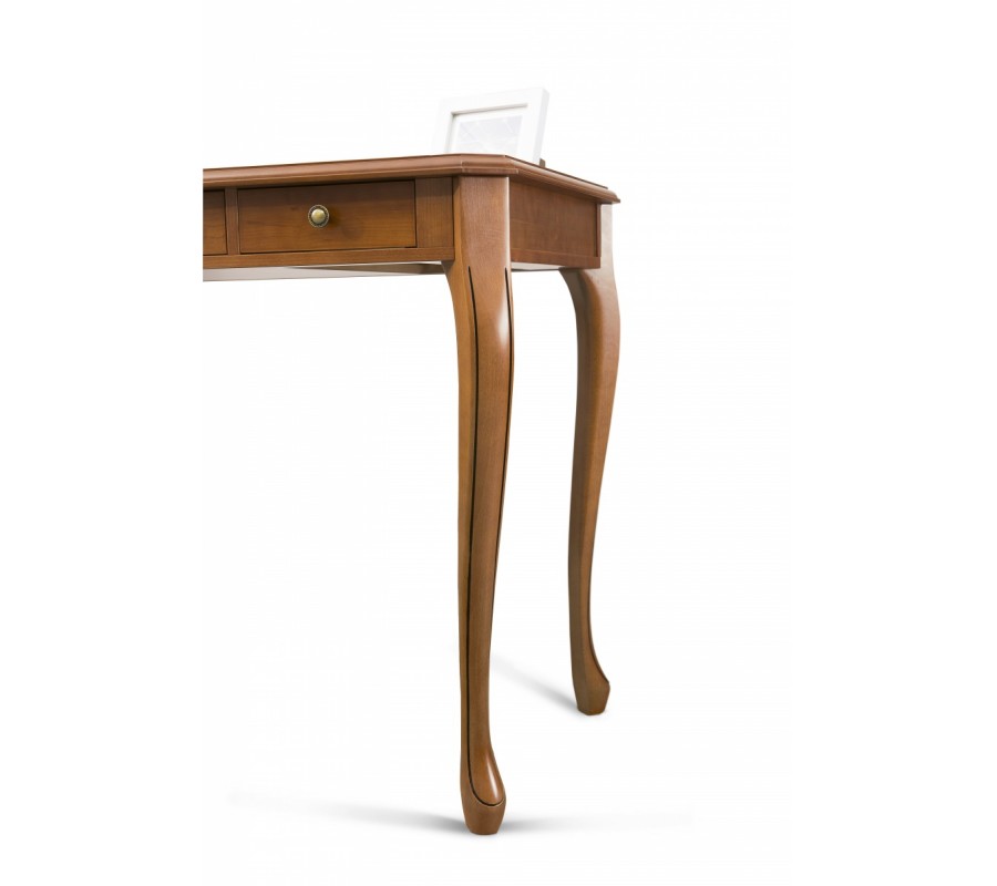 Jedinečný rustikálny pracovný stôl CASTILLA z bukového masívu. Bukové drevo je chránené kvalitnou drevenou dyhou. Tento štýlový pracovný stôl patrí medzi najkvalitnejší zákazkový nábytok s dlhoročnou životnosťou. Vzhľadom, aj vďaka tvarom nôh, dekoratívneho zdobenia a rúčok na zásuvkách, pripomína nábytok z obdobia romantizmu. Masívny písací stôl CASTILLA je k dispozícií vo viacerých farebných prevedeniach. Nohy stolu sú k dispozícií v troch variantoch, ako je zobrazené na poslednom obrázku. V prípade objednávky prosím, špecifikujte aký typ nôh si želáte objednať. Produkt na fotografií je vo farebnom prevedení čerešňa.