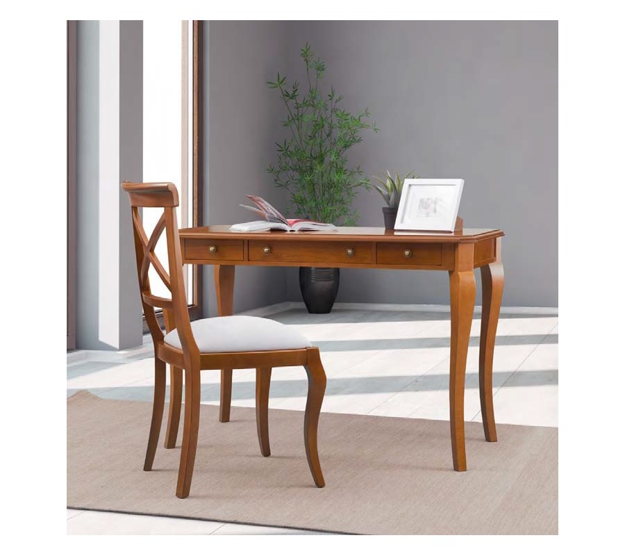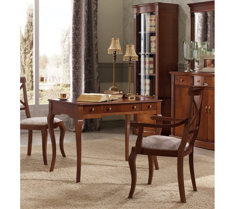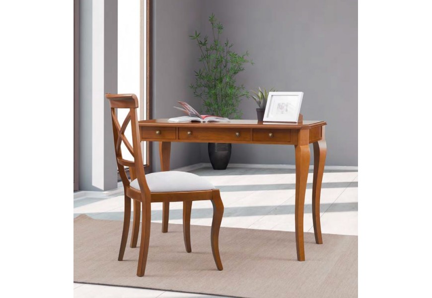 Luxusný rustikálny pracovný stolík Rustica z bukového masívneho dreva zaujme svojim elegantným a klasickým dizajnom s prvkami rustikálneho štýlu. Stolík okrem vkusného a nadčasového vzhľadu ponúka úložný priestor v podobe troch zásuviek pod vrchnou doskou. Stolík možno rovnako ako všetok nábytok kolekcie Rustica vyhotoviť vo viacerých farebných prevedeniach podľa vzorkovníka dreva. Vhodný je pre umiestnenie do domácej pracovne v rustikálnom klasickom štýle.