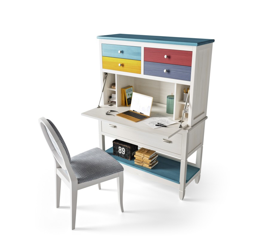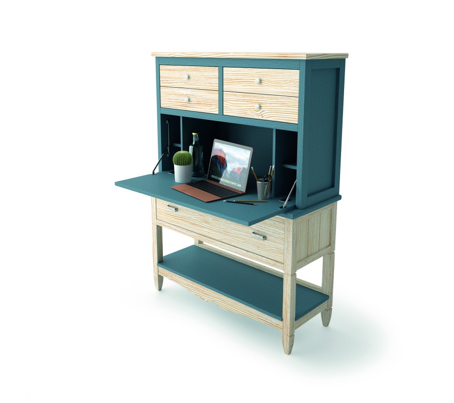 Písací stôl je vyrábaný na zákazku z kvalitného masívneho dreva, čo mu dodáva vysokú kvalitu prevedenia a luxusný charakter. K dispozícii je vzorkovník so širokou ponukou povrchových úprav, od prírodných až po sýte a pastelové kontrastné odtiene. Takisto je možné farebne prispôsobiť jednotlivé časti nábytku pre unikátny dizajn presne podľa vašich predstáv.