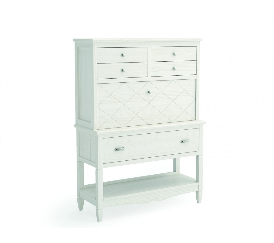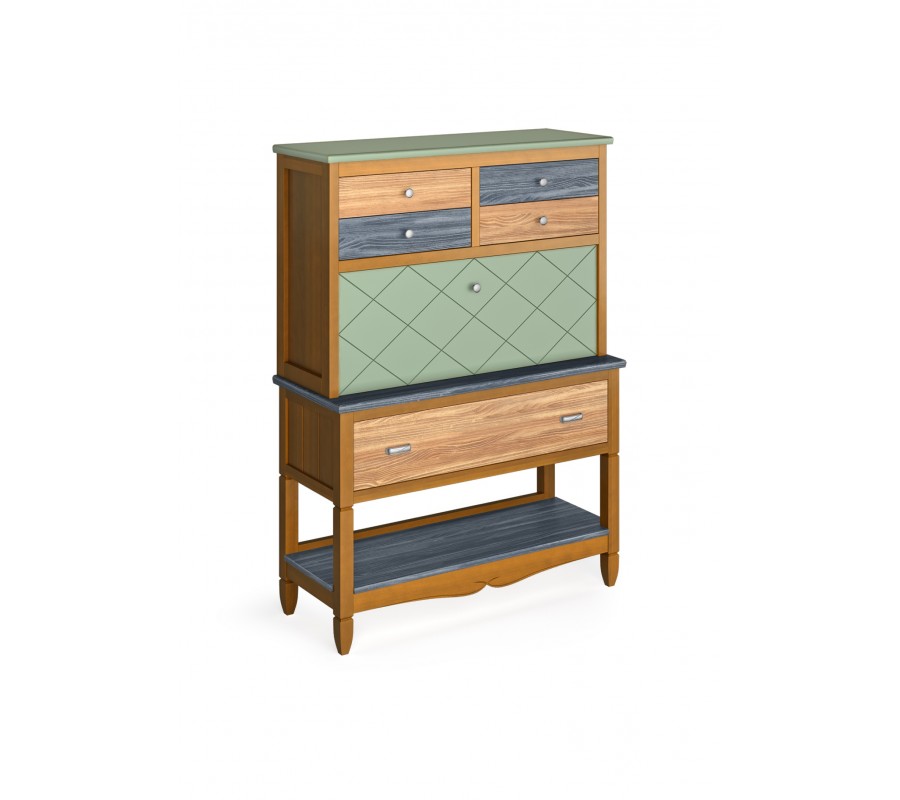 Vo vrchnej časti dopĺňajú úložný priestor štyri zásuvky umiestnené v dvoch radoch s okrúhlymi kovovými úchytkami a lineárna rímsa nad nimi. Pod pracovnou plochou sa nachádza široká zásuvka, ktorá je hlbšia ako vrchná časť a poskytuje tak výbornú oporu pre dosku stola. Dopĺňajú ju dve obdĺžnikové kovové úchytky. Dlhé nohy majú hranatý profil a v spodnej časti je medzi nimi umiestnená veľká otvorená polica. Pod policou sú ich konce zoštíhlené. Tento detail, v kombinácii s vyrezávanou ozdobnou lištou s dvomi oblúkmi dodáva nábytku vidiecky výraz.