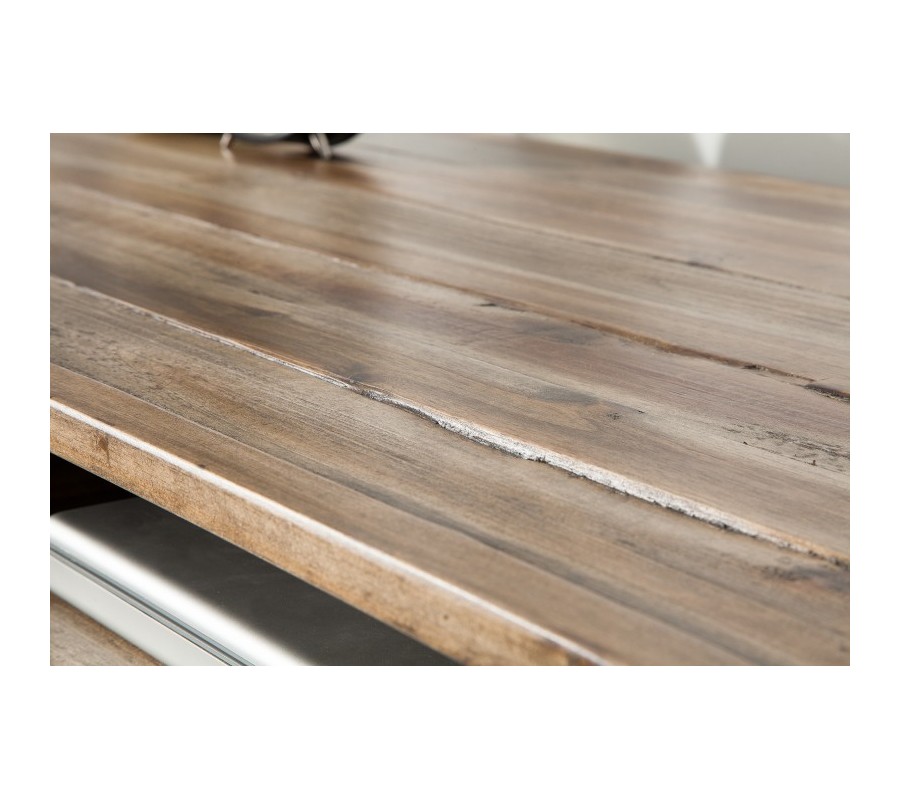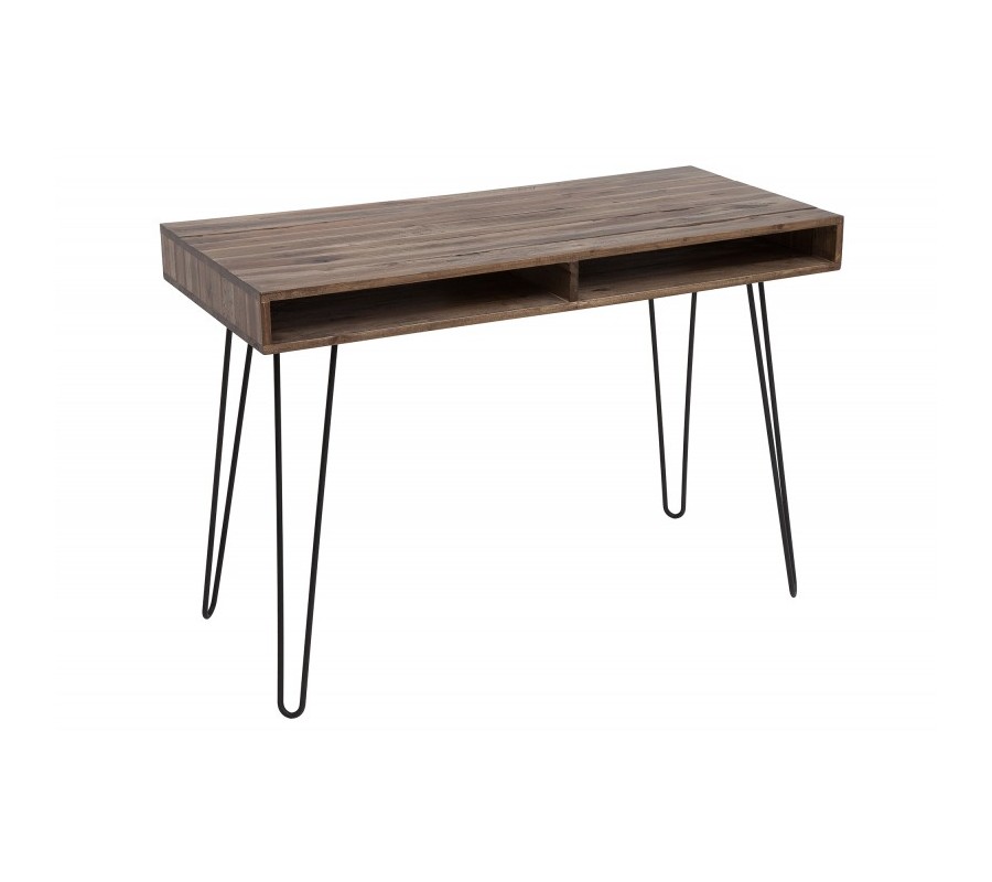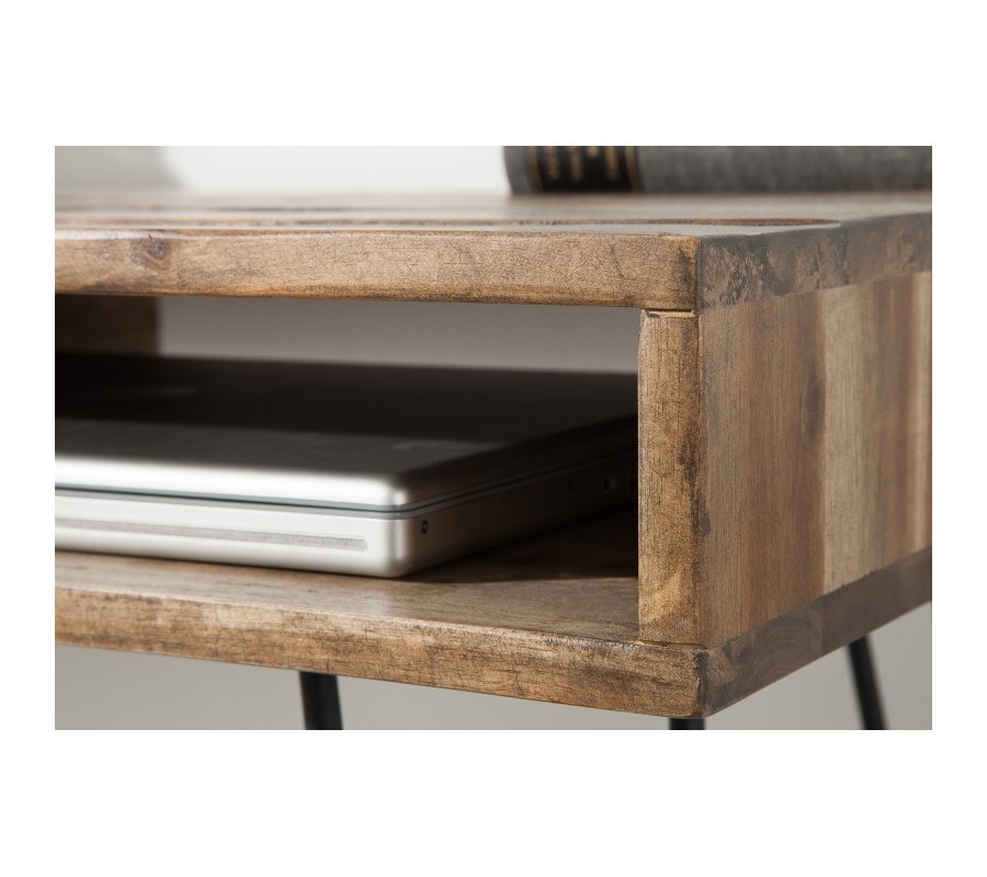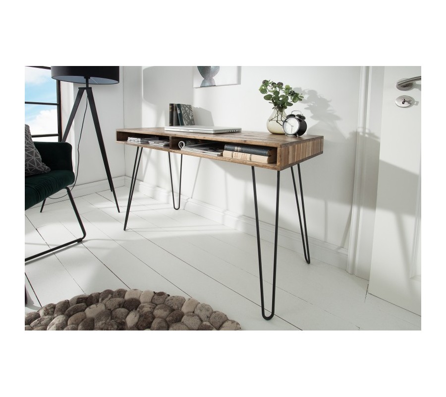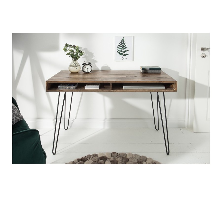 Tento jedinečný kancelársky stôl z našej dizajnovej kolekcie Leeds vašej pracovni dodá štýlový retro vzhľad! Jeho zaujímavé prevedenie spestrí vaše priestory a vďaka univerzálnej prírodnej farbe dreva je ľahko kombinovateľný a hodí sa skutočne všade. Kancelársky stôl Leeds disponuje dvomi praktickými poličkami na uskladnenie dokumentov či kancelárskych potrieb. Vyrobený je z masívneho dreva a s čiernymi kovovými nohami vytvára nadčasovú kombináciu, ktorá v sebe nesie znaky retro či industriálneho štýlu. Pre dokonalý dojem odporúčame doladenie industriálnymi doplnkami či výraznejším farebným kúskom, napríklad kobercom či dekoráciou na stenu.