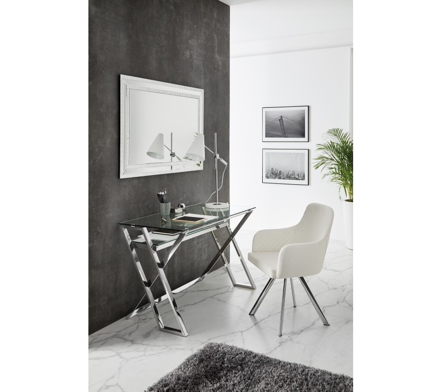 Moderný písací stolík Aletta na prvý pohľad pôsobí veľmi luxusne, no netreba zabúdať ani na jeho unikátne praktické prevedenie, ktoré vás rozhodne očarí. Stolík je postavený na strieborných kovových nožičkách v tvare písmena X, ktoré okrem stability ponúkajú aj krásny dizajn, v ktorom sú nožičky v pomere 2:1, čo dodáva unikátny a veľmi moderný vzhľad stolíku Aletta. Vrchná doska je jedinečná vďaka svojmu prevedeniu v podobe tvrdeného skla s hrúbkou 10mm. Písací stolík Aletta taktiež disponuje aj praktickou sklenenou poličkou o hrúbke 8mm zasadenou na nožičkách pod vrchnou doskou, ktorá ponúka úložný priestor pre knihy, zošity a podobné pracovné potreby. Kombinácia týchto troch prvkov vytvára unikátny a exkluzívny pocit z písacieho stolíka Aletta, ktorý vďaka svojej striebornej podstave a skleneným doskám osvetlí a opticky zväčší váš moderne ladený priestor. Písací stolík Aletta odporúčame kombinovať so skleneným a svetlým nábytkom v modernom prevedení so striebornými kovovými doplnkami.