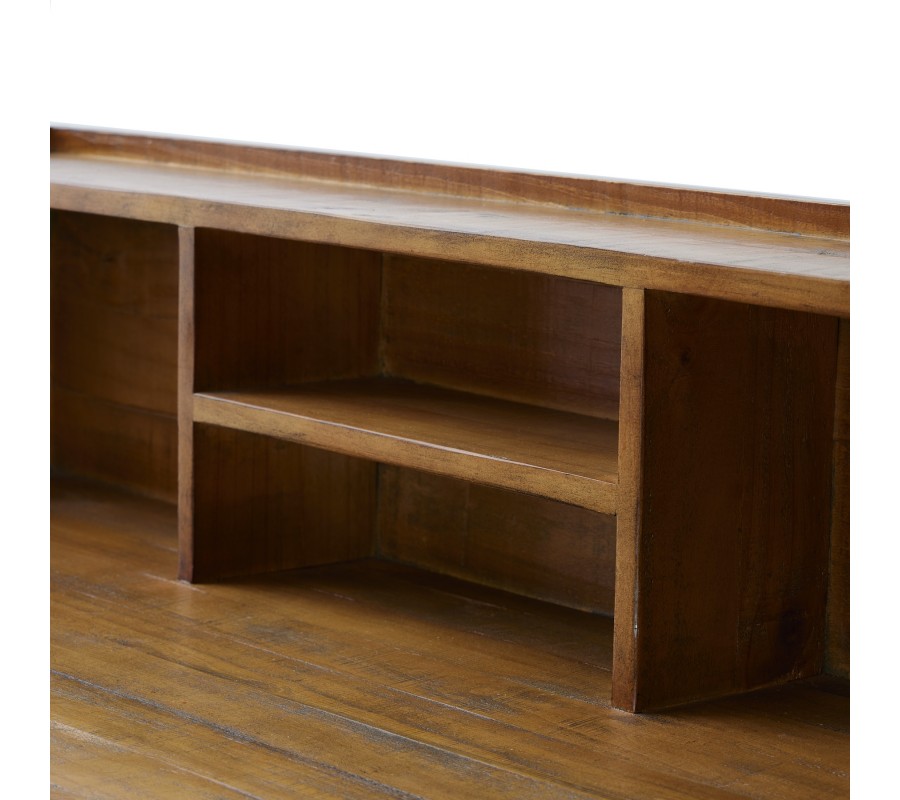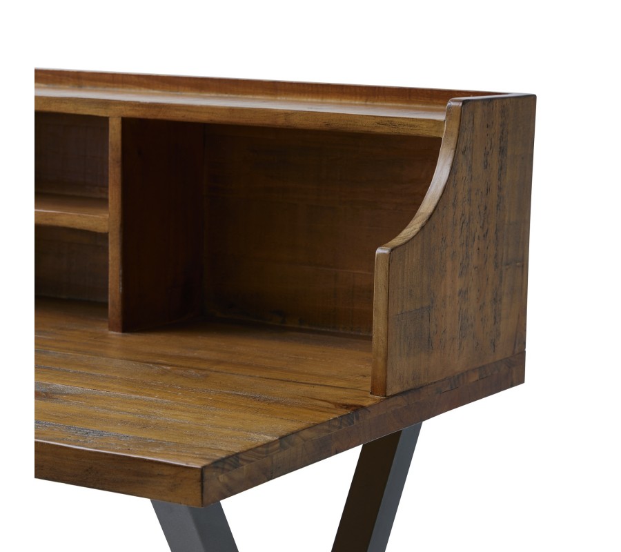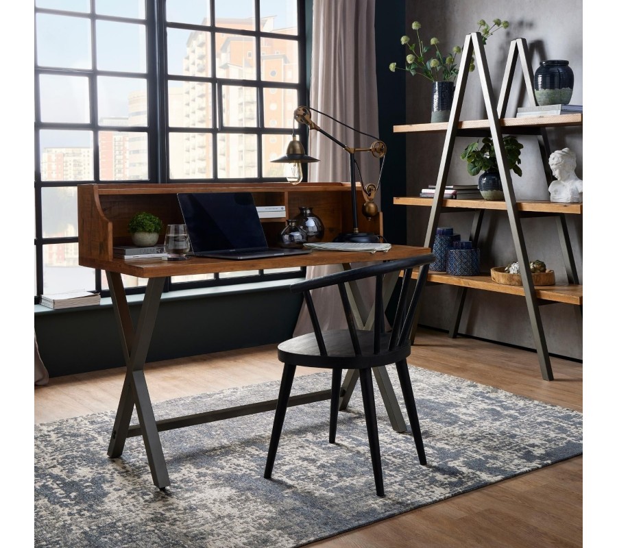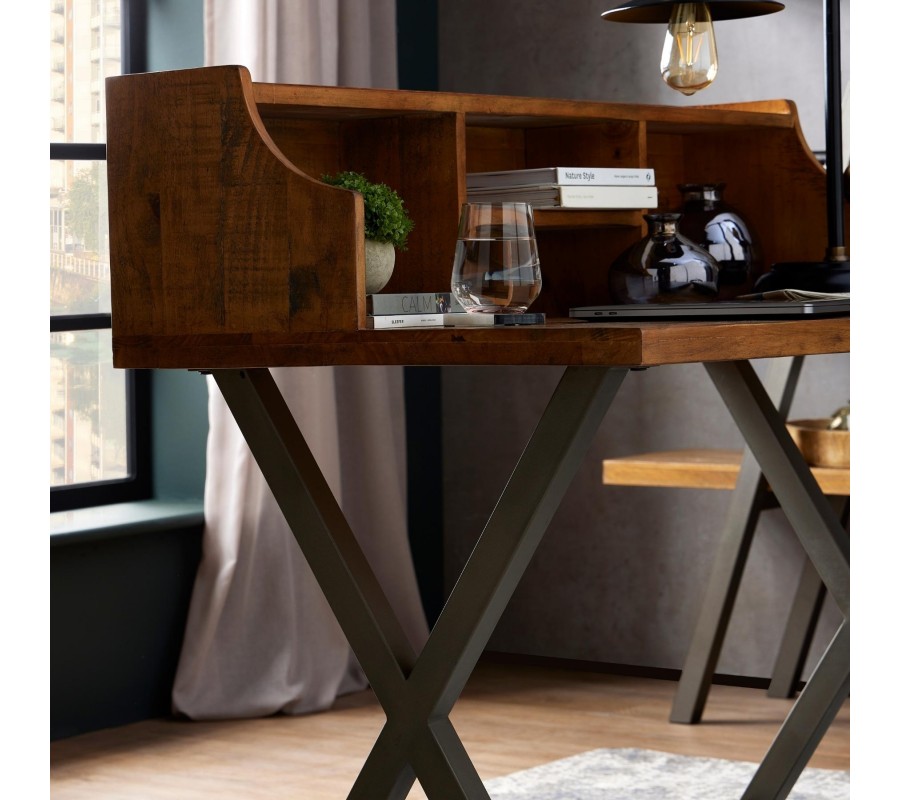 Štýlový pracovný stolík z kolekcie industriálneho nábytku Durand je vhodným doplnkom do každej industriálne či moderne ladenej pracovne. Je praktickým kúskom na prácu najmä vďaka otvoreným poličkám, ktorý poskytujú úložný priestor pre všetky vaše potrebné pomôcky a iné predmety. Vrchná časť zároveň môže slúžiť na vystavenie rôznych dekorácií či izbových rastlín. Konštrukcia stolíka z kvalitného masívneho dreva v príjemnej hnedej farbe je doplnená o sivé prekrížené nohy z kovu. Táto kontrastná kombinácia vytvára štýlový industriálny vzhľad, ktorý zapadne do každého moderného či alternatívne ladeného priestoru. Pre dokonalý industriálny dojem odporúčame taktiež kombináciu s ďalšími kúskami z našej kolekcie Durand