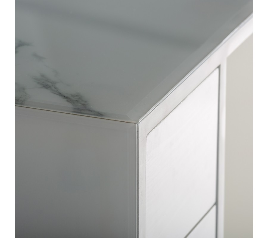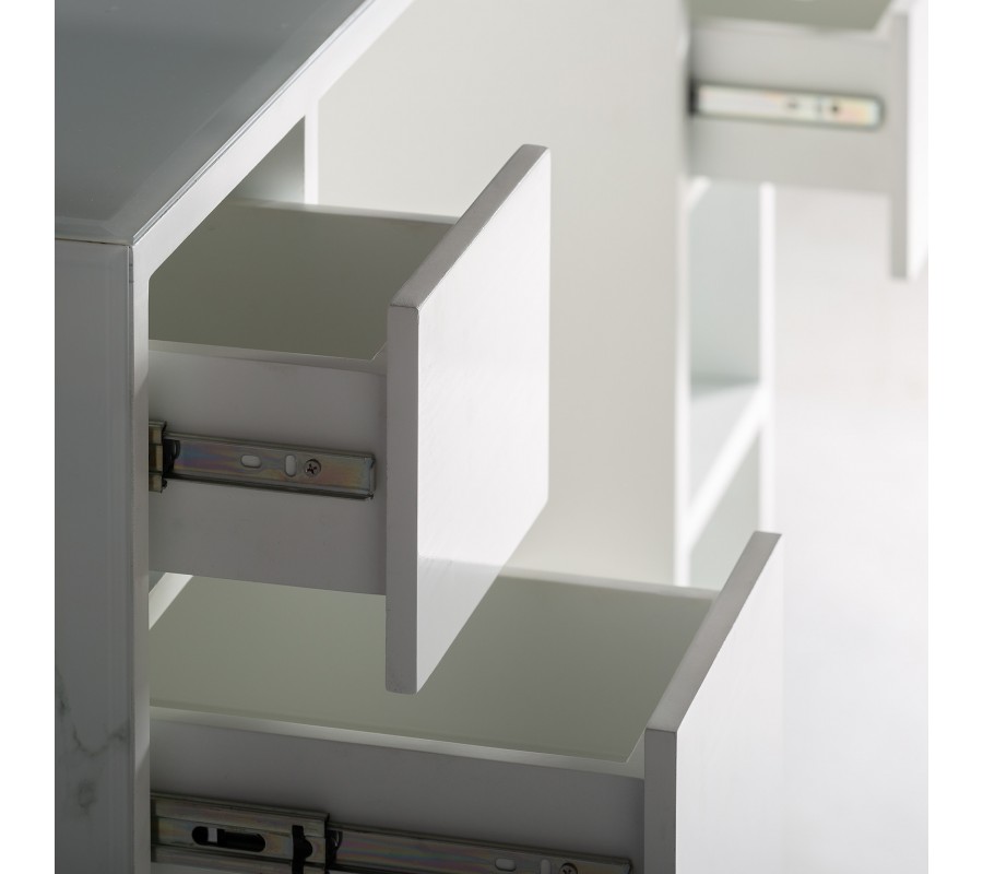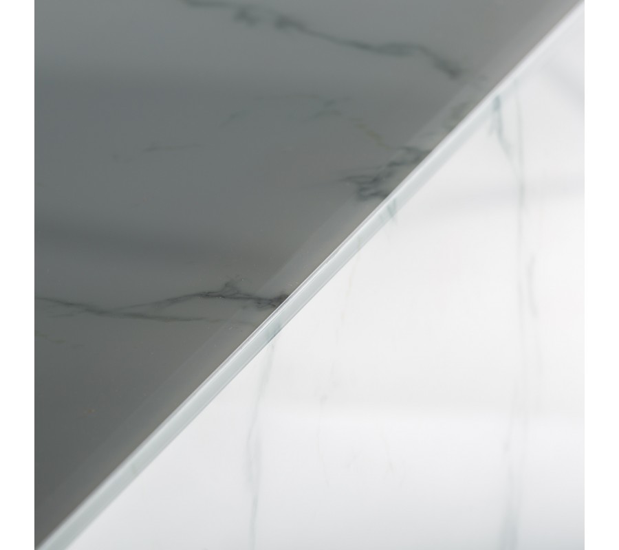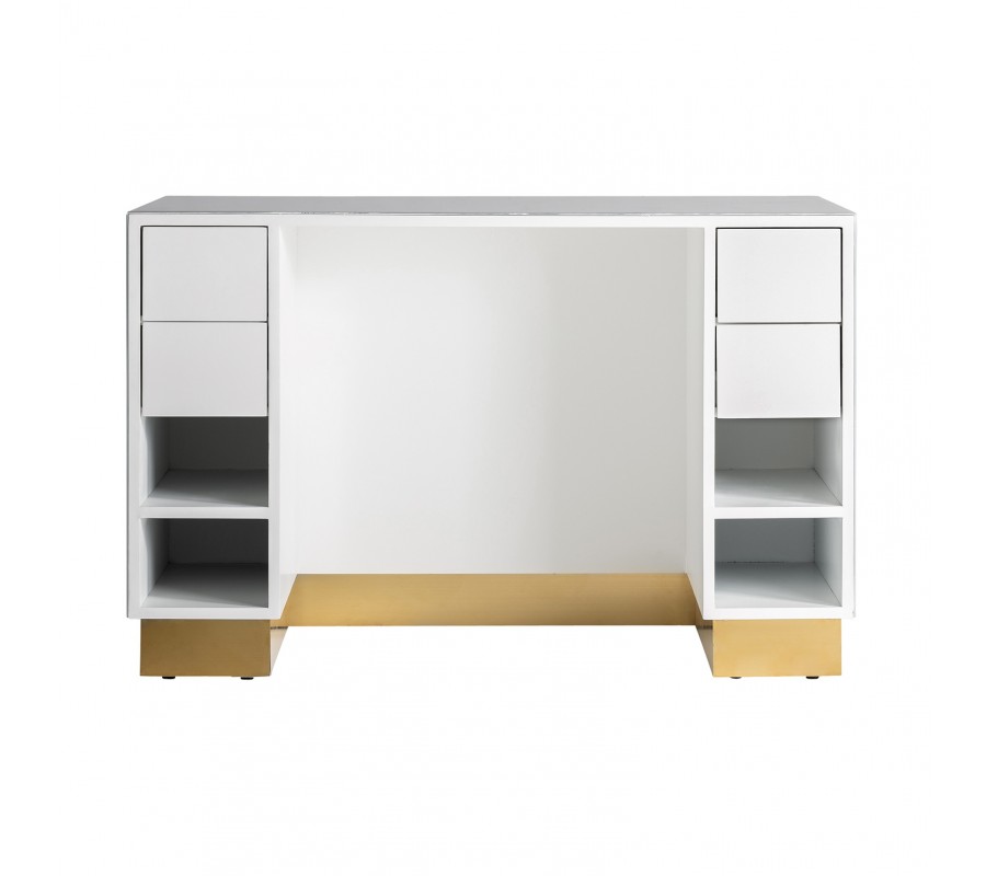 Luxusný kancelársky stolík Moraira je jedinečným prepojením elegancie a nadčasového dizajnu. Stolík z kombinácie skla a kovu sa nesie v štýlovej bielej farbe s povrchovou úpravou s efektom mramoru. Kombináciou so zlatým podstavcom vzniká štýlový art-deco dizajn, ktorý zapadne predovšetkým do moderne ladených interiérov. Stolík disponuje štyrmi praktickými zásuvkami a štyrmi otvorenými poličkami, vďaka čomu bude organizácia vašich kancelárskych potrieb hračkou. Dizajn stolíka Moraira tak zaujme každého, kto hľadá originálny a elegantný kúsok na osvieženie svojej pracovne, obývačky či kancelárskych priestorov. Pre dokonalý art-deco vzhľad odporúčame kombináciu so zamatovým čalúneným kreslom a sklenenými či kovovými dekoráciami.