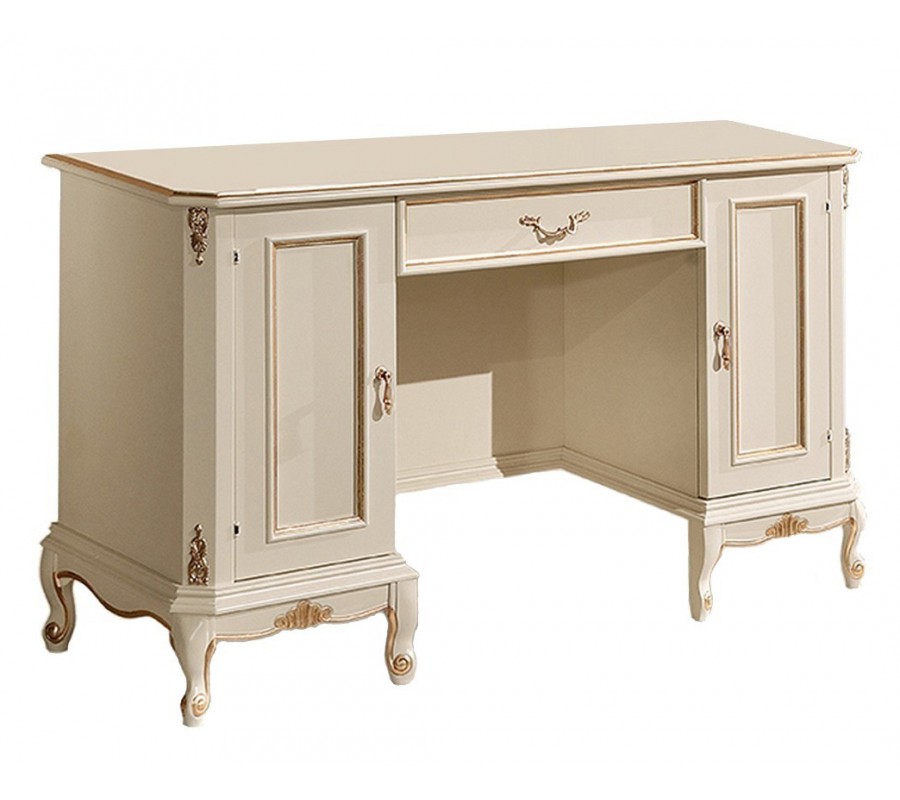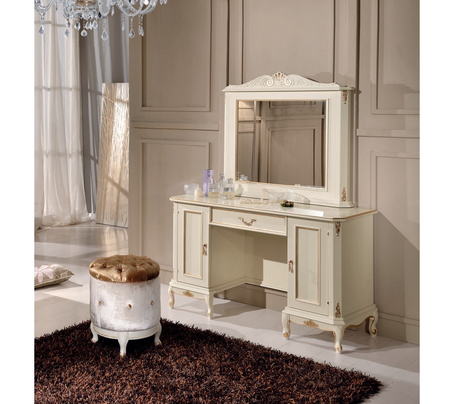 Luxusný toaletný stolík z našej talianskej kolekcie Emociones očarí každého svojimi originálnymi a ručne opracovanými detailmi. Všetky kusy nábytku z kolekcie Emociones majú jedinečný dizajn, ktorý zaujme najmä milovníkov barokového a zámockého štýlu. Stolík je vyrobený z kvalitného masívneho dreva v slonovinovej farbe, zdobí ho ručné vyrezávanie majstrov, čo pridáva na jeho hodnote. Najsilnejším prvkom stola sú detailne vypracované oblé nožičky, čo je typickým znakom pre štýl známeho navrhára Thomasa Chippendale. Na toaletnom stolíku sa nachádzajú taktiež ozdobné kovové úchytky dvierok a zásuviek v antickej zlatej farbe, ktoré mu dodávajú čaro. Zrkadlo, ktoré je súčasťou toaletného stolíka je vsadené do rámu a vyrobené z masívneho dreva v bielej farbe. Stolík disponuje praktickými úložnými priestormi t. j. jednou zásuvkou a dvomi skrinkami. Farbu stolíka si môžete podľa svojich predstáv vybrať zo vzorkovníka. Stolík môžete doplniť elegantnou taburetkou z našej Emociones kolekcie.