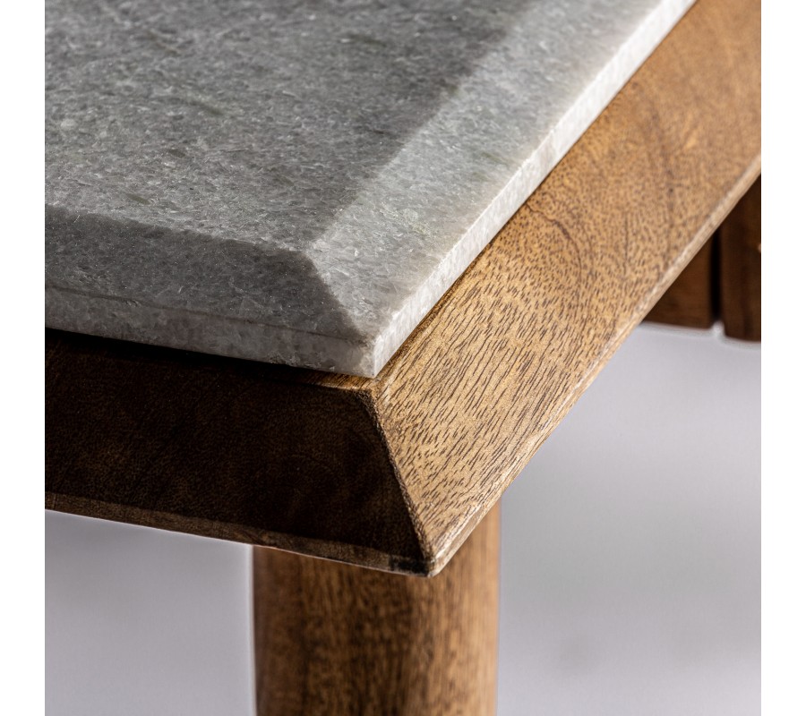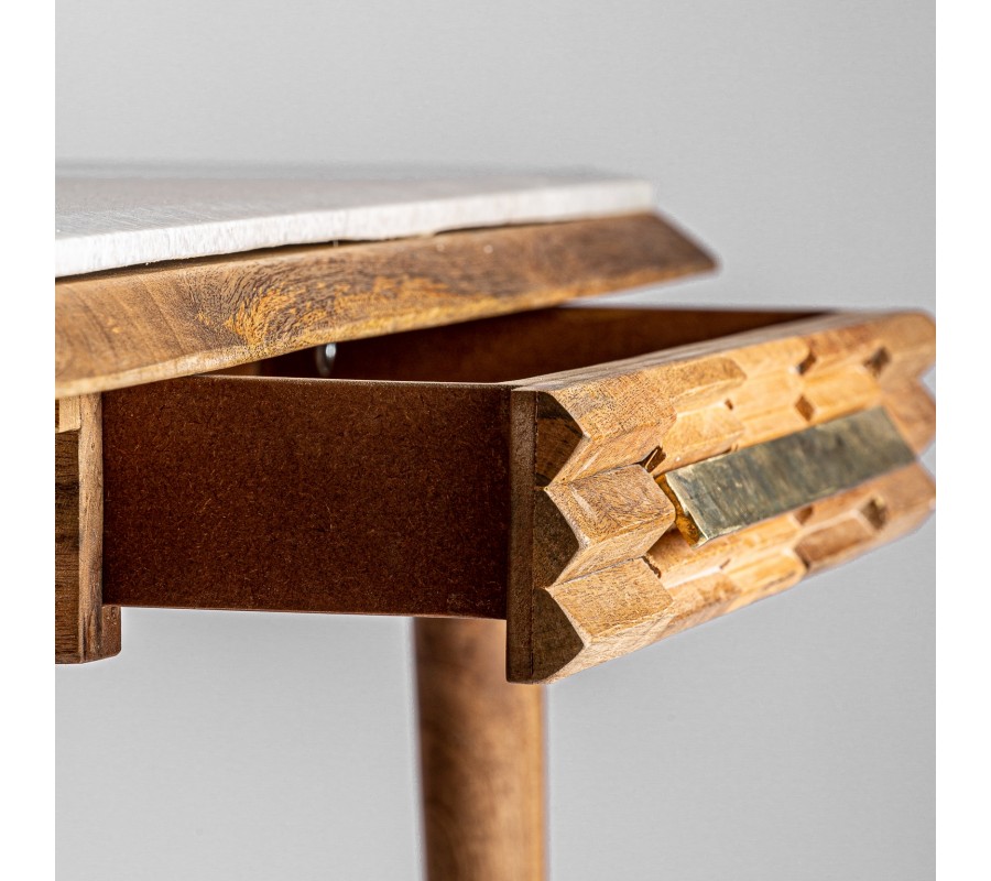 Luxusný písací stolík Plissé Nature sa vyznačuje unikátnym prevedením, ktoré je typické pre túto jedinečnú kolekciu mramorového nábytku. Konštrukcia stolíka je vyhotovená z kvalitného mangového masívneho dreva, ktoré je povrchovo upravené tak, aby sa zvýraznil prirodzený drevený vzhľad vo svetlej hnedej farbe s nádychom vidieckeho štýlu. Stolík je postavený na štyroch nožičkách a disponuje masívnou doskou, na vrch ktorej je vložená svetlo sivá mramorová vrchná doska, ktorá vytvára luxusný vzhľad a pevný povrch pre spohodlenie práce za stolom. Písací stolík Plissé Nature taktiež disponuje zásuvkou, ktorá je dizajnovým ťahúňom stolíka. Doska je okrem vyrezávania so štvorcovým vzorom obohatená aj o zlatú kovovú rukoväť, čo v spojení so sivou mramorovou doskou vytvorí unikátny vzhľad, ktorý sa vynikajúco kombinuje v interiéroch v štýle art deco. Vďaka svojmu farebnému prevedeniu odporúčame kombinovať písací stolík Plissé Nature v tmavých priestoroch so svetlým masívnym nábytkom a zlatými kovovými doplnkami