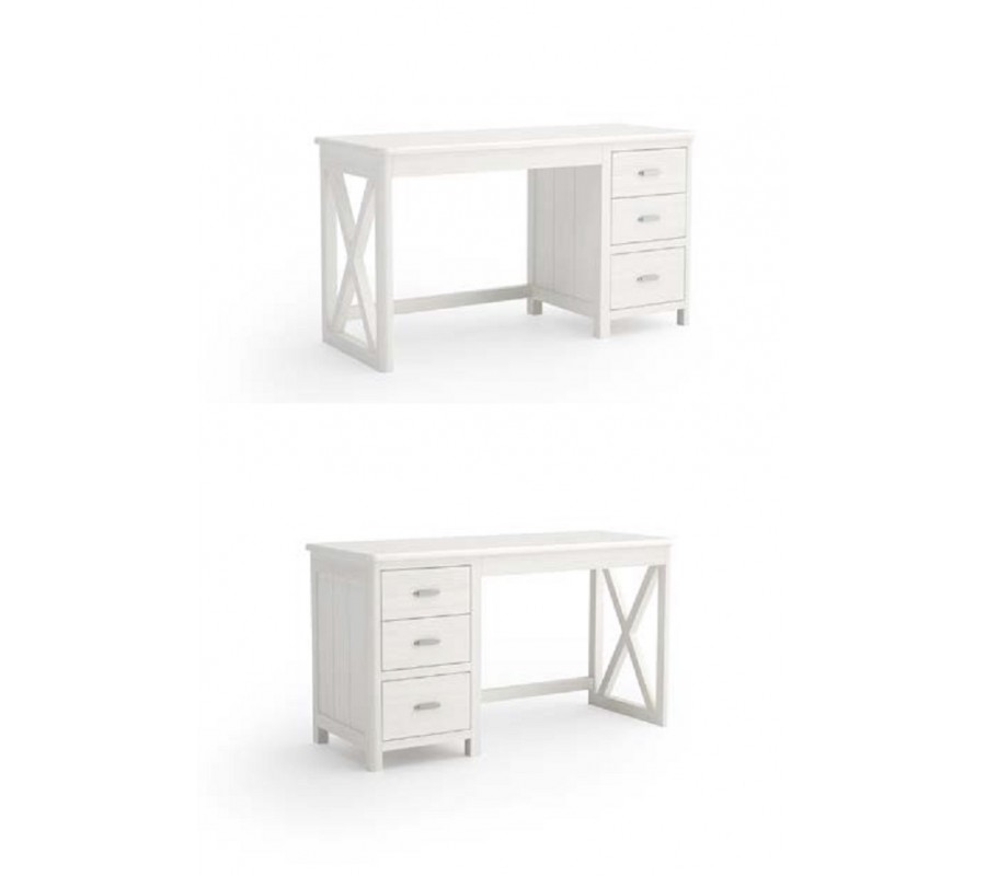 Písací stôl má obdĺžnikovú vrchnú dosku so šírkou 140 cm, ktorú je možné rozložiť až na 170 cm. V dizajne dominujú rovné línie, doplnené o jemné zaoblenia na predných rohoch, dodávajúce nábytku eleganciu. Dosku podopiera na jednej strane noha v tvare X, ohraničená plochým rámom. Na opačnej strane sa nachádza úložný priestor s tromi zásuvkami umiestnenými nad sebou. Dopĺňajú ich ploché kovové úchytky a sú podopreté štyrmi nízkymi nožičkami pre ešte lepšiu stabilitu. Môžete si zvoliť, či máte záujem o umiestnenie zásuviek na pravej alebo ľavej strane.