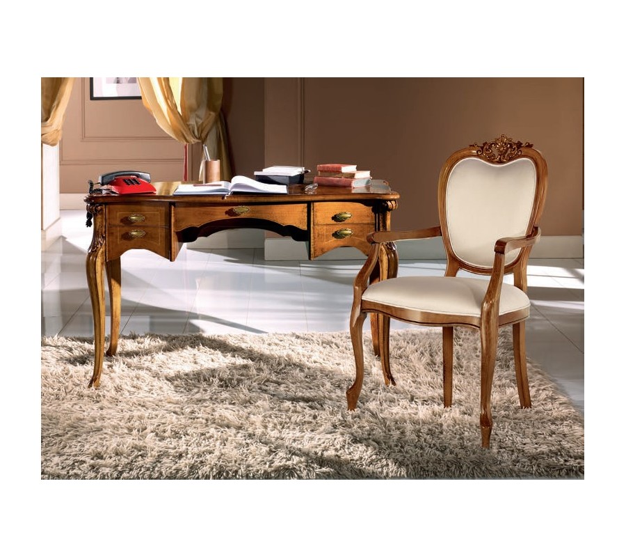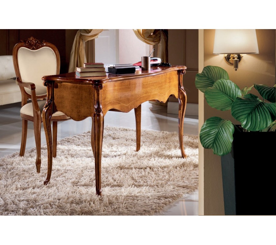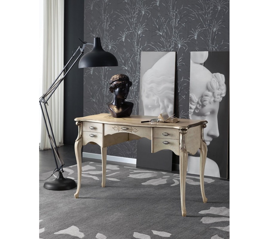 Luxusný kancelársky stolík z jedinečnej kolekcie talianskeho nábytku Pasiones je kúskom vhodným pre všetkých milovníkov klasického a rustikálneho štýlu. Už na prvý pohľad zaujme svojím elegantným prevedením z masívneho dreva a elegantným obdĺžnikovým tvarom, pričom povrchová úprava je obohatená o precízne ručné vyrezávanie a vkusné ornamentálne zdobenie. Písací stolík disponuje piatimi praktickými zásuvkami, ktoré dopĺňajú jemné kovové rukoväte. Na výber ponúkame viacero možných farebných prevedení dreva aj rukovätí, vďaka čomu máte možnosť vytvoriť si skutočne jedinečný a originálny kúsok vhodný do vášho interiéru. Kancelársky stolík Pasiones vynikne predovšetým v kombinácii s luxusným čalúneným kreslom a ďalším masívnym kancelárskym nábytkom. Doladením do rustikálne či klasicky ladených priestorov dosiahnete nezameniteľný starožitný vzhľad.