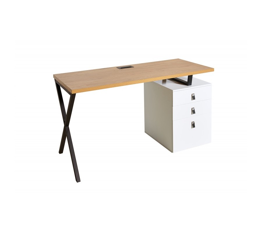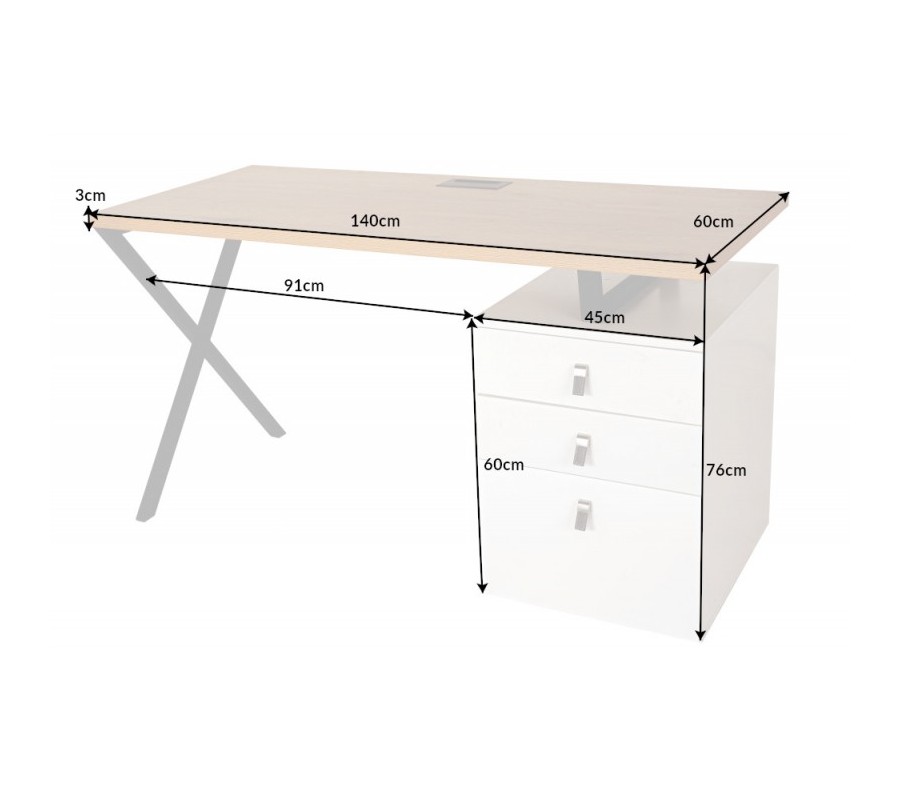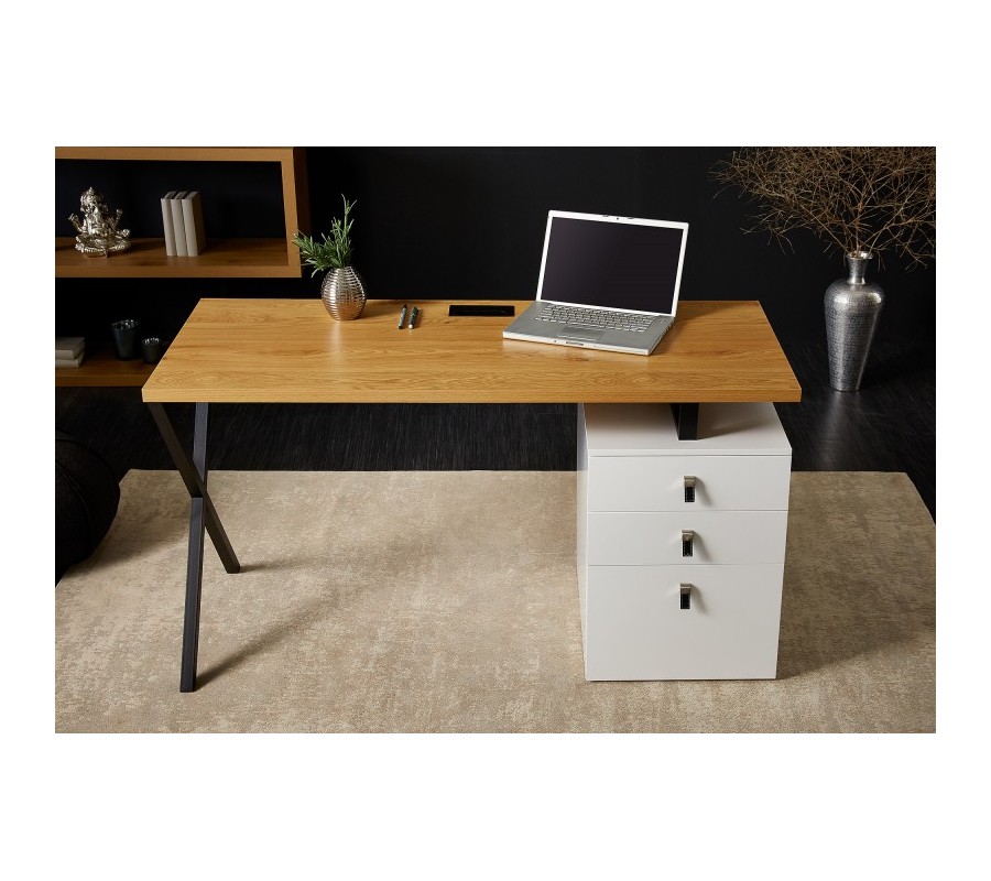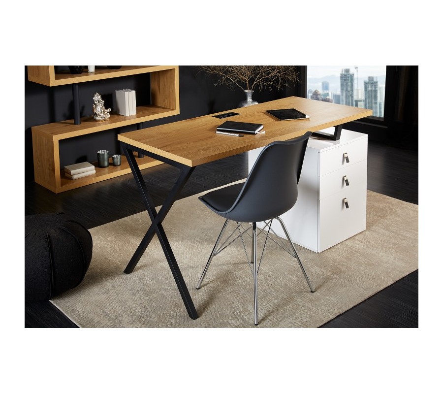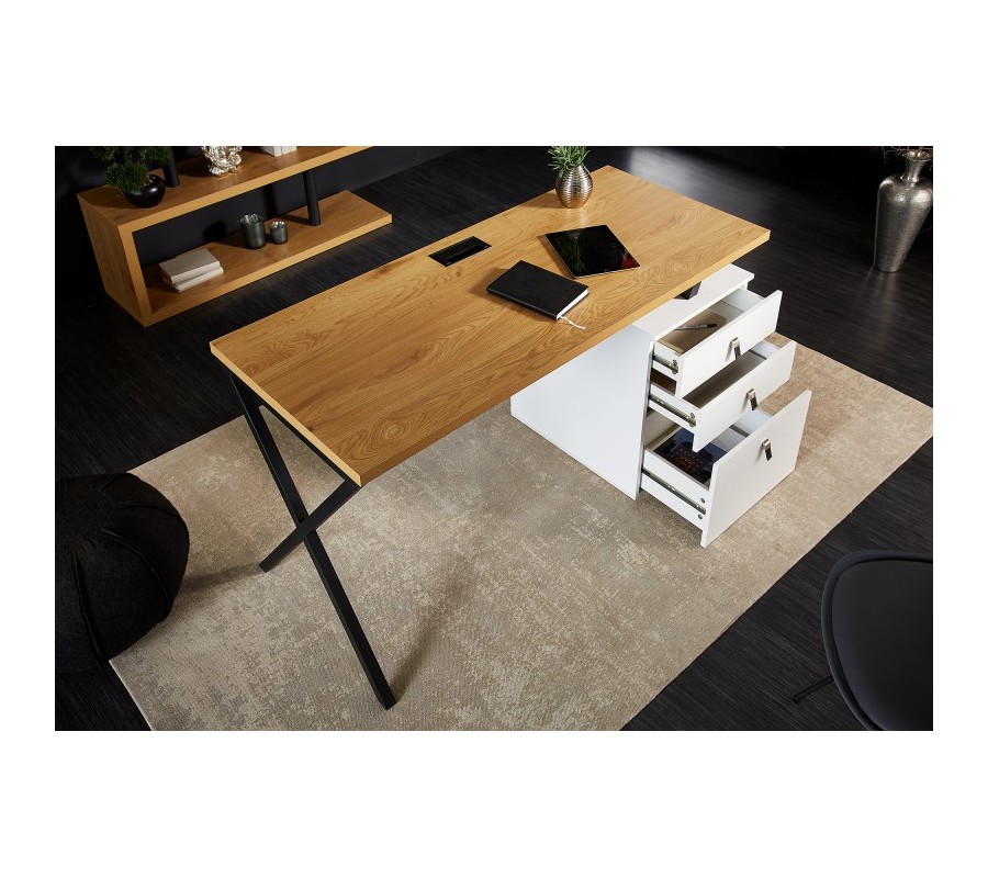 Štýlový kancelársky stôl Westford je vhodným doplnkom do moderných a industriálne ladených pracovní, kancelárií alebo študentských izieb. Zaujme svojou stavbou z masívneho dubového dreva, ktorú dopĺňajú prekrížené kovové nohy. Farebnej kombinácii hnedej povrchovej dosky a čiernych nôh vytvárajú konrtast tri biele zásuvky s elegantnými koženými rukoväťami. Vďaka prepojeniu prírodného materiálu a kovu vzniká nezameniteľný industriálny nádych, ktorý dizajnovo oživí každý moderných interiér. Skvelú kombináciu vytvorí napríklad s kovovou masívnou stoličkou s koženým čalúnením, masívnou knižnicou a minimalistickými odplnkami z kovu.