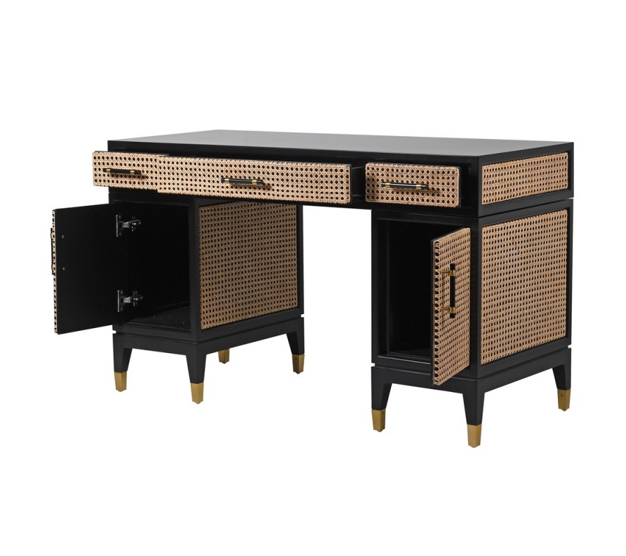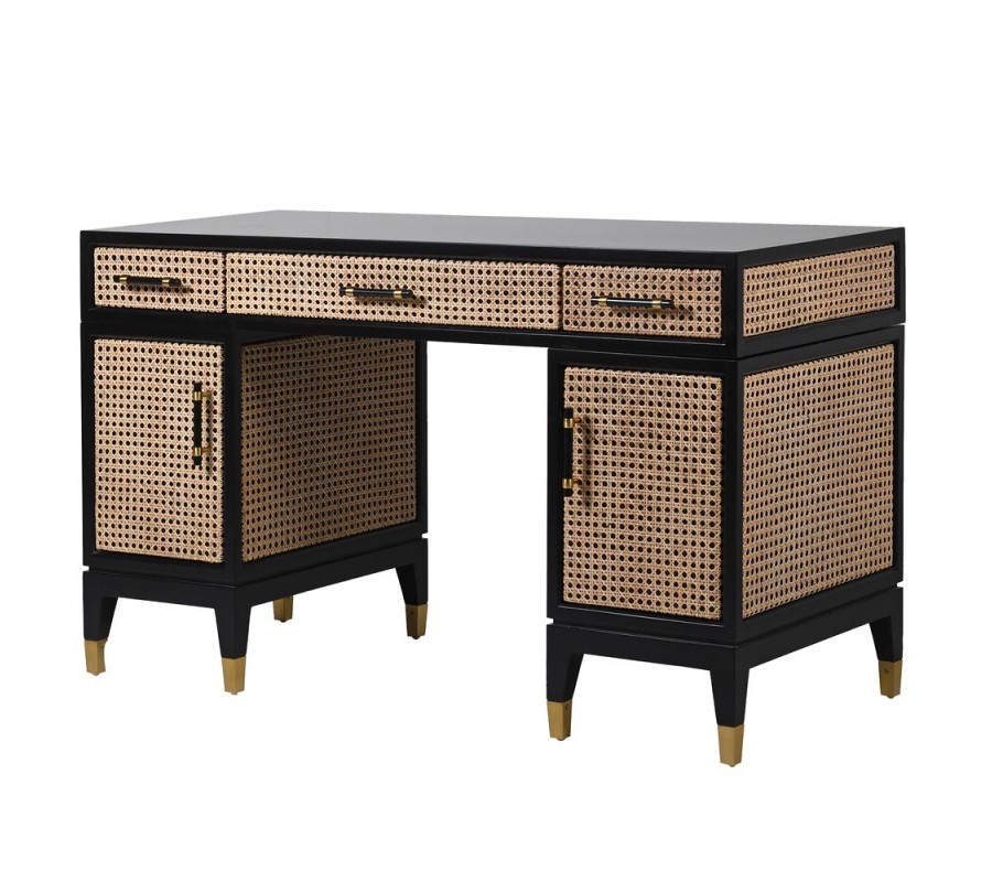 Art-deco dizajnový písací stôl Ratana z masívneho dreva čiernej farby s troma zásuvkami a ratanovým dekorom 130cm