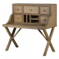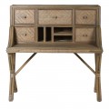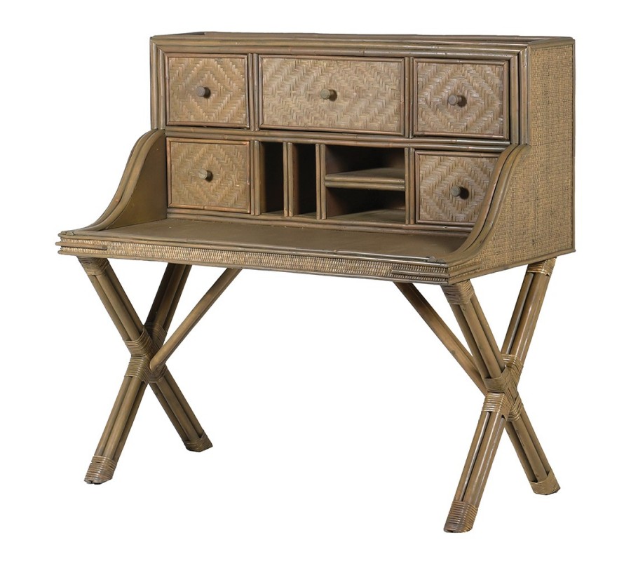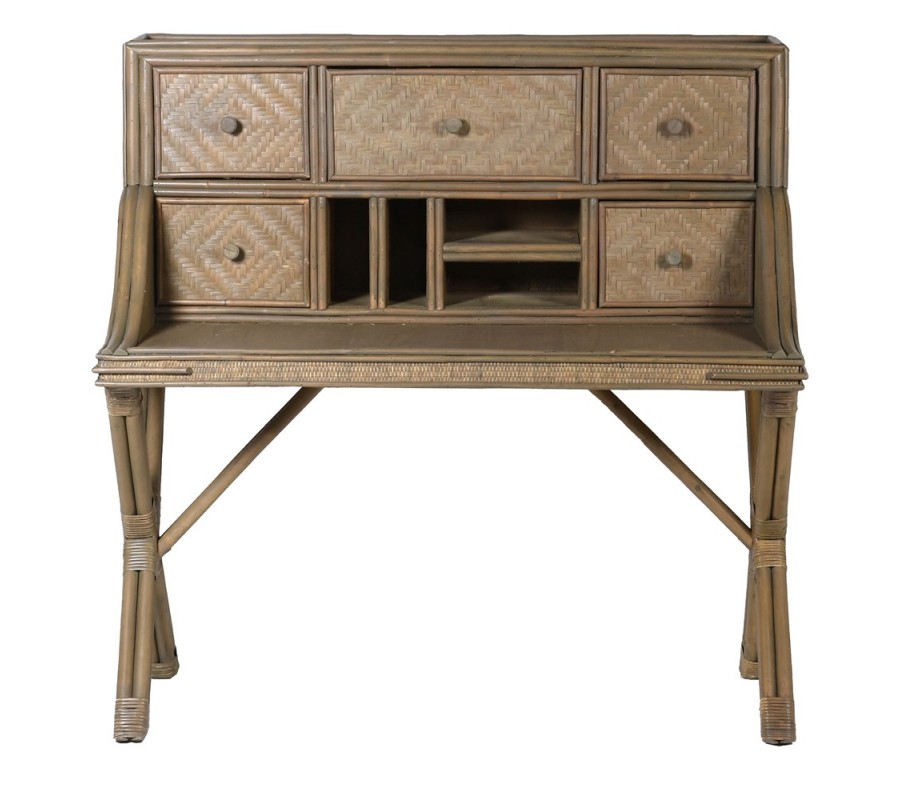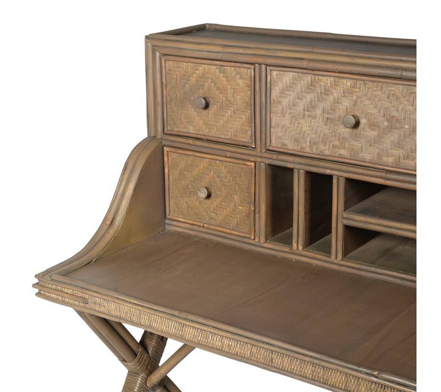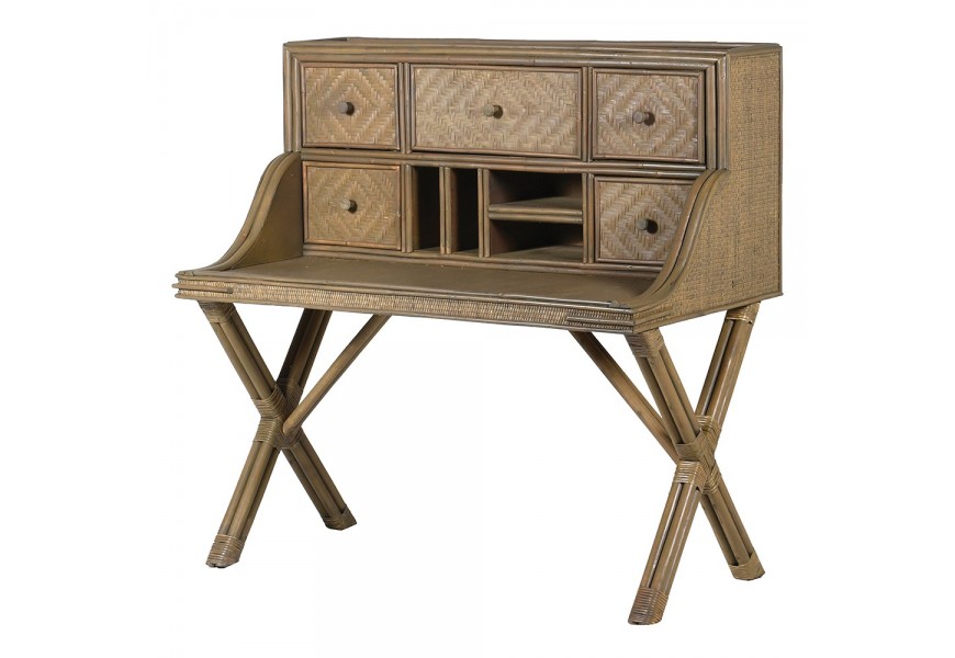 Ratanový písací stolík Bony v koloniálnom štýle so zásuvkami a prekríženými nohami v čokoládovo hnedej farbe 115cm