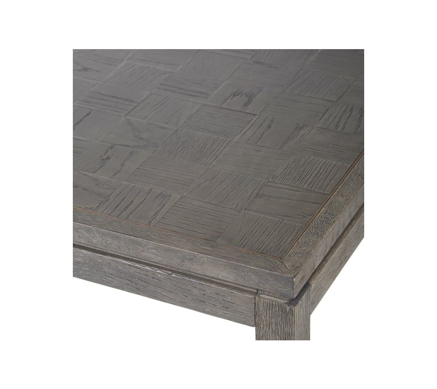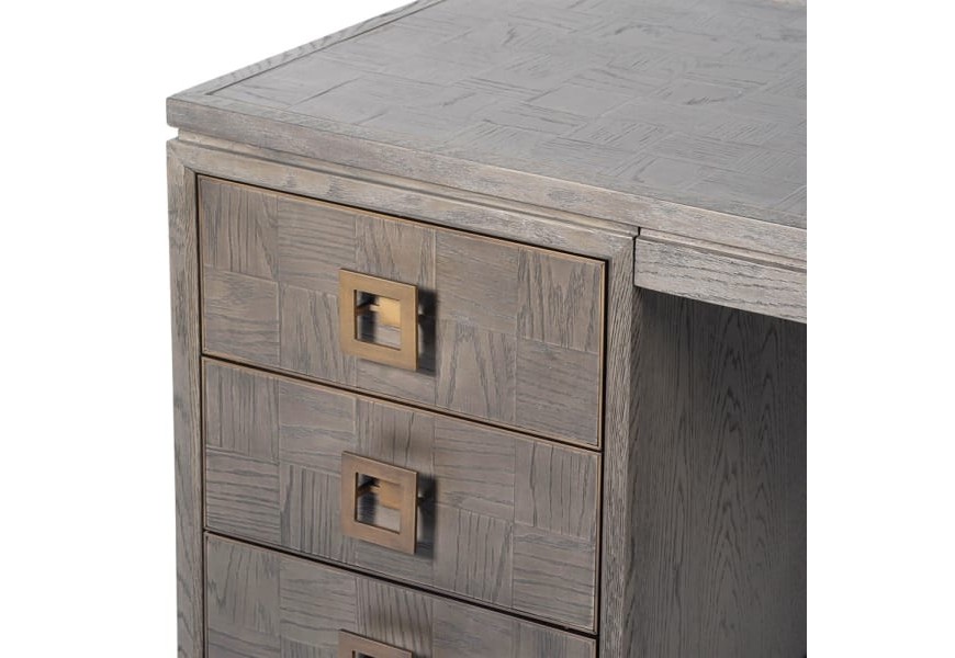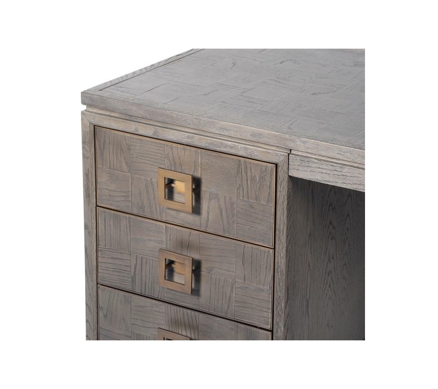 Luxusný kancelársky stôl Quadria Gris vás je skvelým kúskom na zariadenie moderne či art deco ladených pracovní, kancelárií alebo študentských izieb. Je vyrobený z masívneho dubového dreva a nesie sa v príjemnej sivohnedej farbe, ktorá do vašich priestorov vnesie útulný nádych. Zároveň je vďaka univerzálnej farebnosti vynikajúcim kúskom na kombinovanie v monochromatických, ale i pestrejších interiéroch. Povrchovú úpravu dopĺňa zaujímavý štvorcový šachovnicový vzor, ktorý je tvorený precíznym ukladaním jednotlivých kúskov dreva s rôznymi smermi letokruhov. Stôl Quadria Gris okrem elegantného dizajnu poteší aj svojím úložným priestorom v podobe troch praktických zásubiek. Zásuvky sú po bokoch lemované zlatým kovovoým zdobením a zdobia ich tiež zlaté rukoväte geometrických štvorcových tvarov. Zlaté ozdobné prvky možno nájsť aj na spodnej časti zúžených nožičiek. Celkový vzhľad kancelárskeho stola Quadria Gris pôsobí luxusným dojmom s art deco nádychom, ktorý môžete umocniť kombináciou s ďalšími kúskami tejto kolekcie. Vhodnými doplnkami sú aj zlaté zrkadlá či rámy s obrazmi, masívna čalúnená kancelárska stolička a jemný koberček či záves vo výraznej farbe.