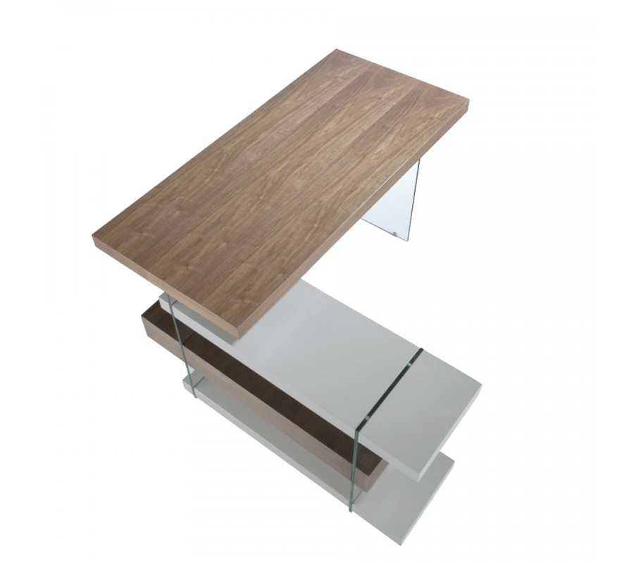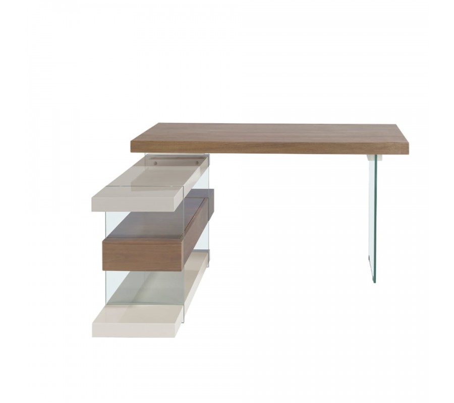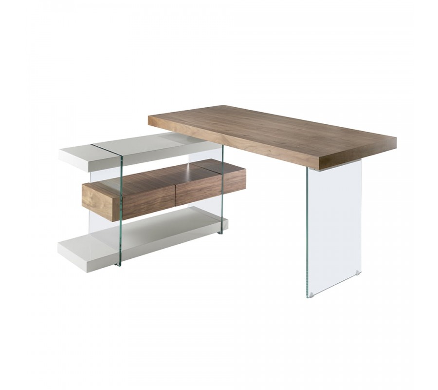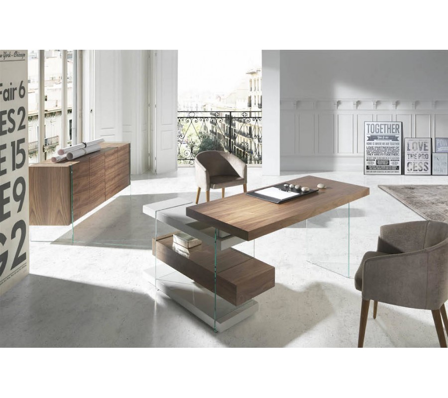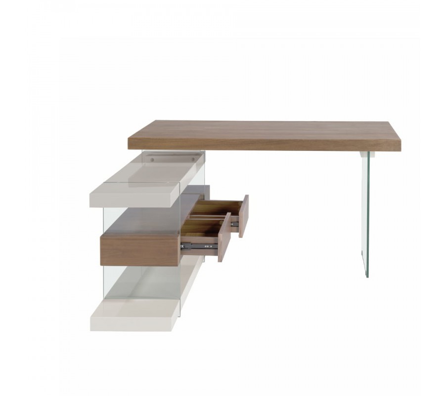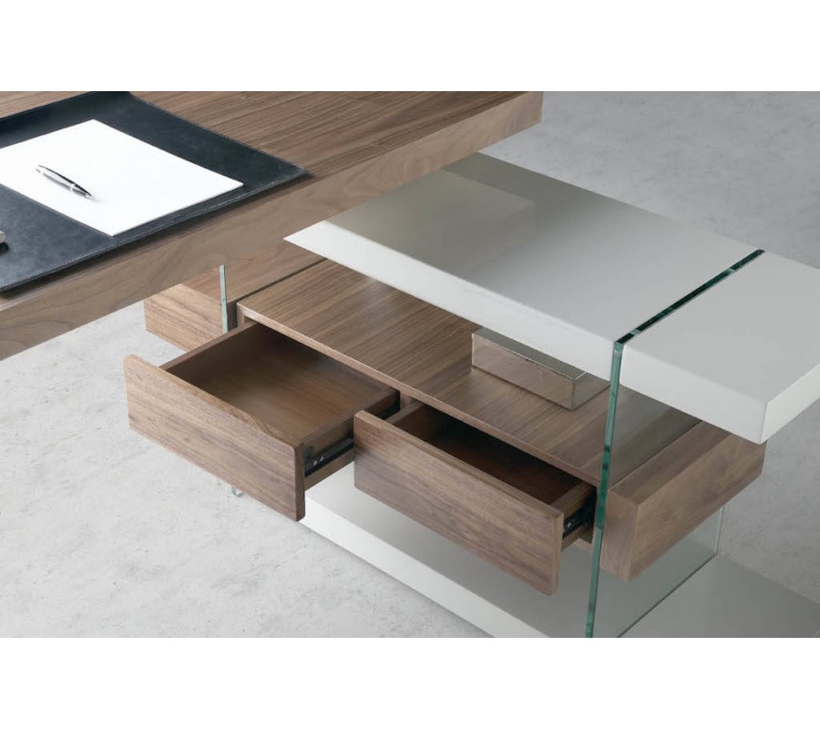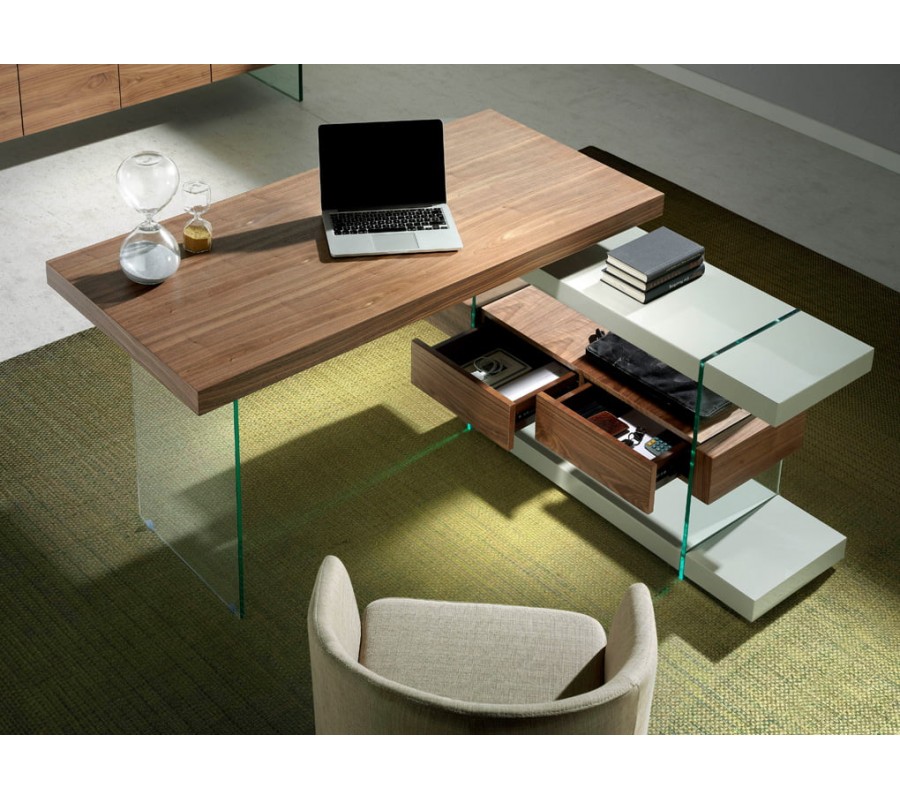 Jedinečnosť dizajnu v priamych líniách a s konštrukciou nožičiek z 12mm hrubého tvrdeného skla je prepojená s unikátnou funkčnosťou, ktorá Vám zaručí príjemné pracovné prostredie. Bočné dosky ponúkajú dostatok priestoru na odloženie Vašich dokumentov, zatiaľ čo dve praktické zásuvky so soft-close mechanizmom iba umocní využitie tohto písacieho stola.