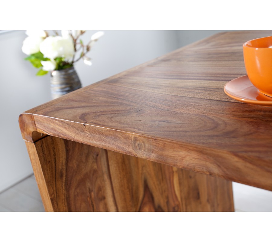 Písací stôl Terra prinesie do vašej pracovne nádych naturálnej harmónie. Hlavnú úlohu hrá masívne sheeshamové drevo, ktorého prirodzená kresba zdobí povrchy stola. Toto prírodné umelecké dielo má možnosť vyniknúť aj vďaka jednoduchej siluete stola. Vrchná časť a bočné strany, na ktorých je stolík postavený tvorí hladká obdĺžniková doska. Tieto časti sú spojené pomocou poloblúkovej dosky tvoriacej zaoblené vrchné hrany stolíka. Inšpirácia pre tento dizajn pochádza z 30. a 40. rokov minulého storočia, kedy sa veľkej popularite tešil takzvaný "waterfall" nábytok, typický oblými hranami pripomínajúcimi vodopád, vyrábaný zväčša z masívneho dreva. Písací stôl Terra vám ponúka tieto retro motívy v modernom prevedení. Môžete ho tak doplniť kancelárskym kreslom v retro štýle. Hodí sa tiež do pracovne či obývačky zariadených masívnym nábytkom vo vidieckom štýle. Teplé odtiene palisandrového dreva môžete tiež skombinovať s doplnkami, napríklad kobercom, v svetlých prírodných odtieňoch hnedej či béžovej. Vytvoríte tak nadčasový neutrálny vzhľad, pri ktorom sa budete môcť naplno sústrediť na vaše pracovné povinnosti. Písací stôl tiež môžete doplniť ďalším nábytkom z kolekcie Terra, ktorý nájdete v našej ponuke. Skvelou voľbou je zásuvný box, ktorý vám poskytne bohatý úložný priestor.